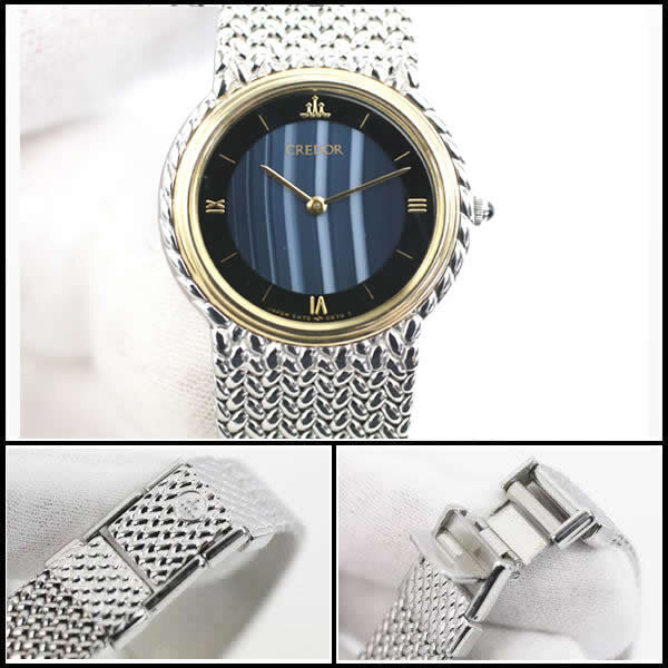 その他商品説明 フランス語で「黄金の頂き」を意味するセイコーのクレドールから、シルバーボディにブルーメノウのコンビネーションが大変美しいレディースウォッチをご紹介します。当商品は世界に誇る国産時計メーカーセイコーの最高峰モデルであり、繊細に編み込まれたメッシュブレスに高級感のある輝きを放つ18KTベゼルが上品な印象です。また、ダイヤルには大変珍しいブルーメノウが使用されており、天然石ならではの縞模様とブルーカラーのコントラストがデザインのアクセントにもなっています。当モデルは希少な「服部セイコー」時に生産されたモデルであり、当品のような美品は大変希少です。この機会に是非ご検討下さい。