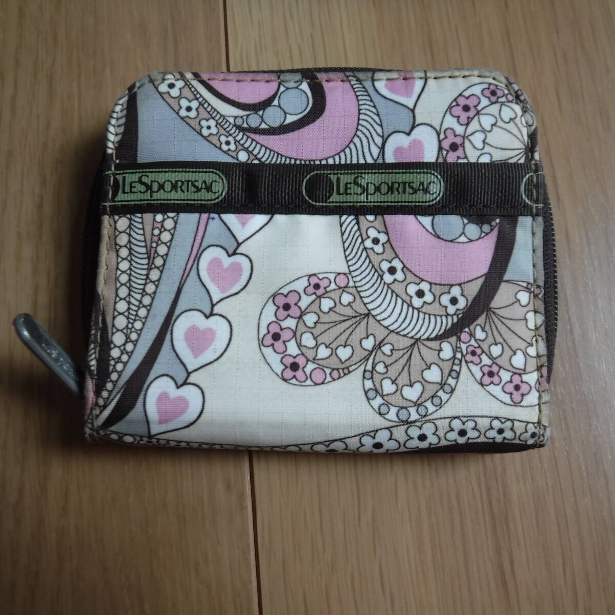 レスポートサックのオフホワイトベースにハートが一面にデザインされた財布で、サイズは個人寸法で横10縦10マチ1.5センチ位、表面に1つポケット有、スナップを開くと内側に2つポケット有、カード収納6か所、札入れ1か所、反対の3/4周ほど開くチャック式の小銭入れは2つに分かれて使いやすいと思います♪全体的に使用感ありますので、格安で出品いたします。まだご使用できる状態かと思いますので、中古品にご理解ある方、ノークレームノーリターンでお願いします!