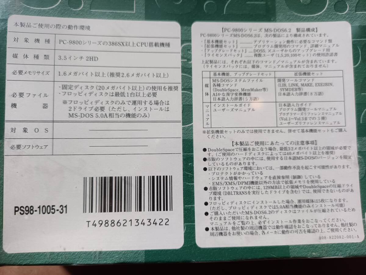 Product name: 未開封品 PC-9800シリーズ MS-DOS6.2 基本機能セット 3.5インチ版 PS98-1005-31