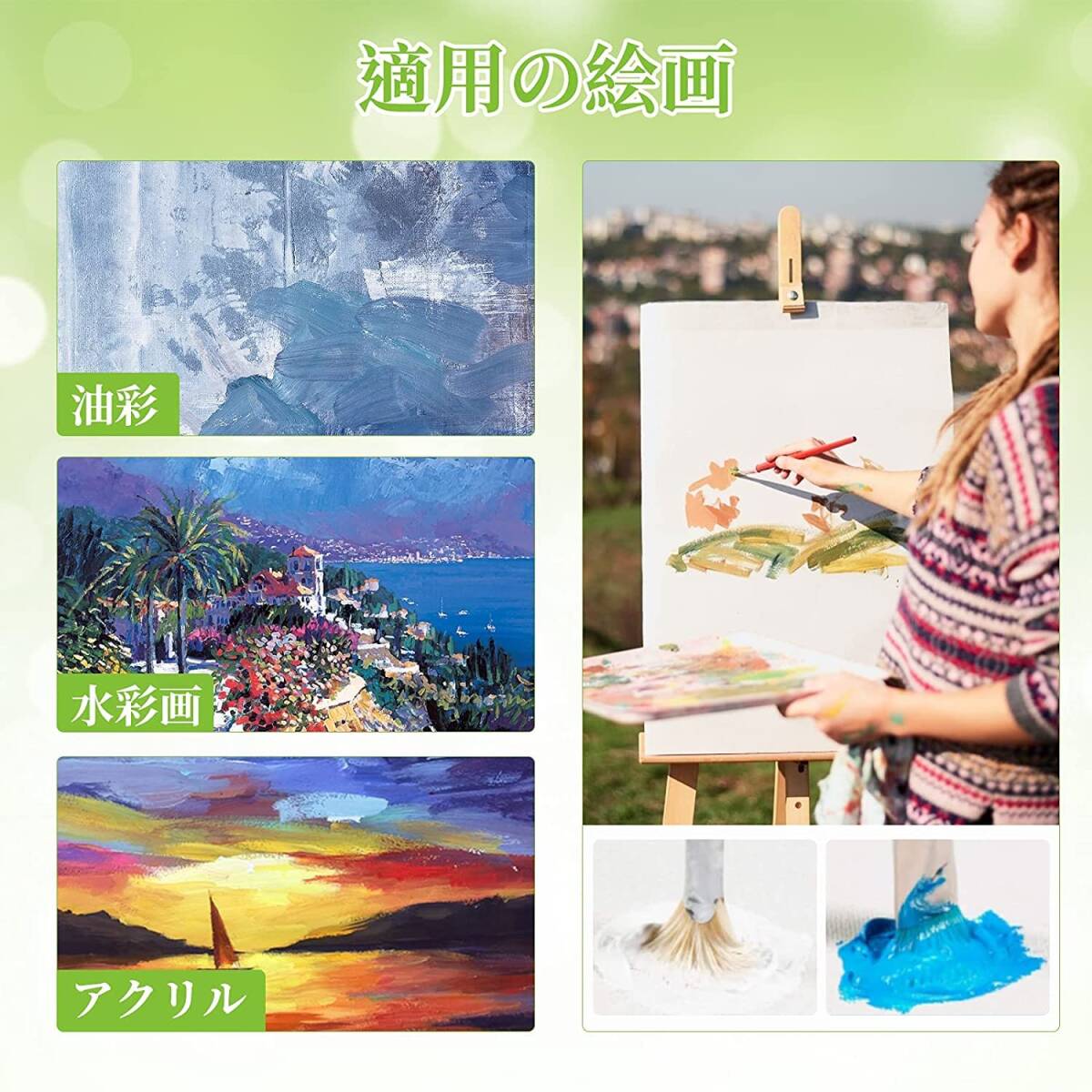 描きやすい:画布は綿化繊混紡の高品質素材を使って、中目のキャンバスです。麻に比べキャンバスの目が均一できれいです。色乗りがよく、描きやすいです。さまざまな絵具に対する吸収性にすぐれ、塗料が漏れにくいです。半吸収性の特性で、油絵だけでなく、アクリル絵の具にも使用できます。
