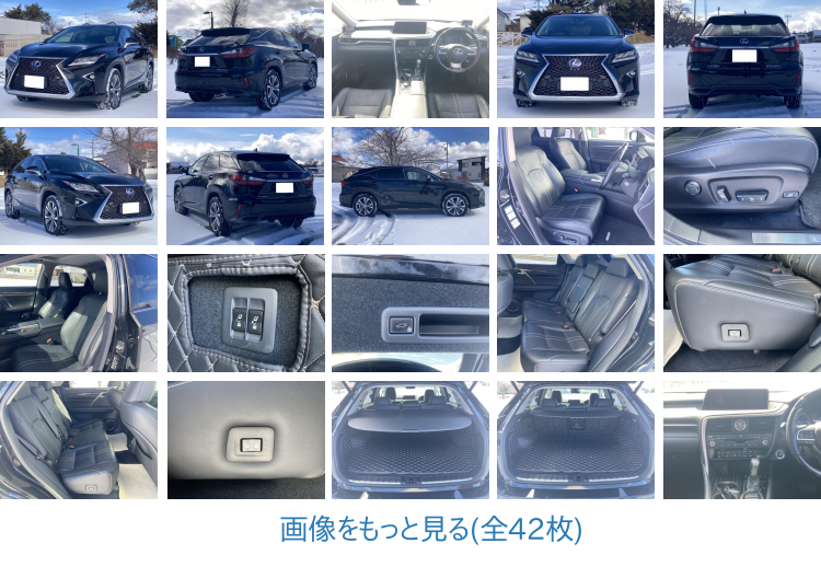 車両状態コメントH.28(2016)年 レクサス RX 450h バージョンL 4WD ブラック 走行58800km・サンルーフ・スペアキー×2・カードキー・純正エンスタ・ETC・本革シート・ナビ・フルセグ・バックカメラ・全席パワーシート・電動リアゲート・クルーズコントロール