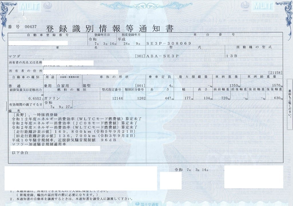 車台番号(下3けた) 069 リサイクル預託金 0 円