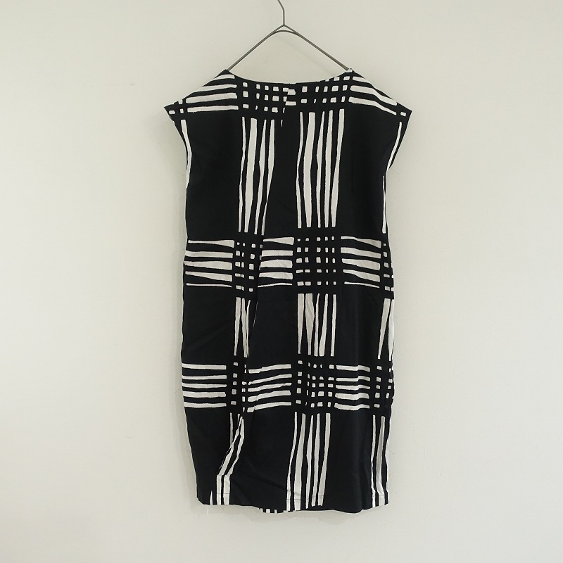 marimekkoのフレンチスリーブワンピースです。カラーはブラック×ホワイト、やや薄手素材で、プルオーバータイプです。前両腰にポケットがあり、上部のみ裏地付きで、ウエスト&裾にタックが施されております。