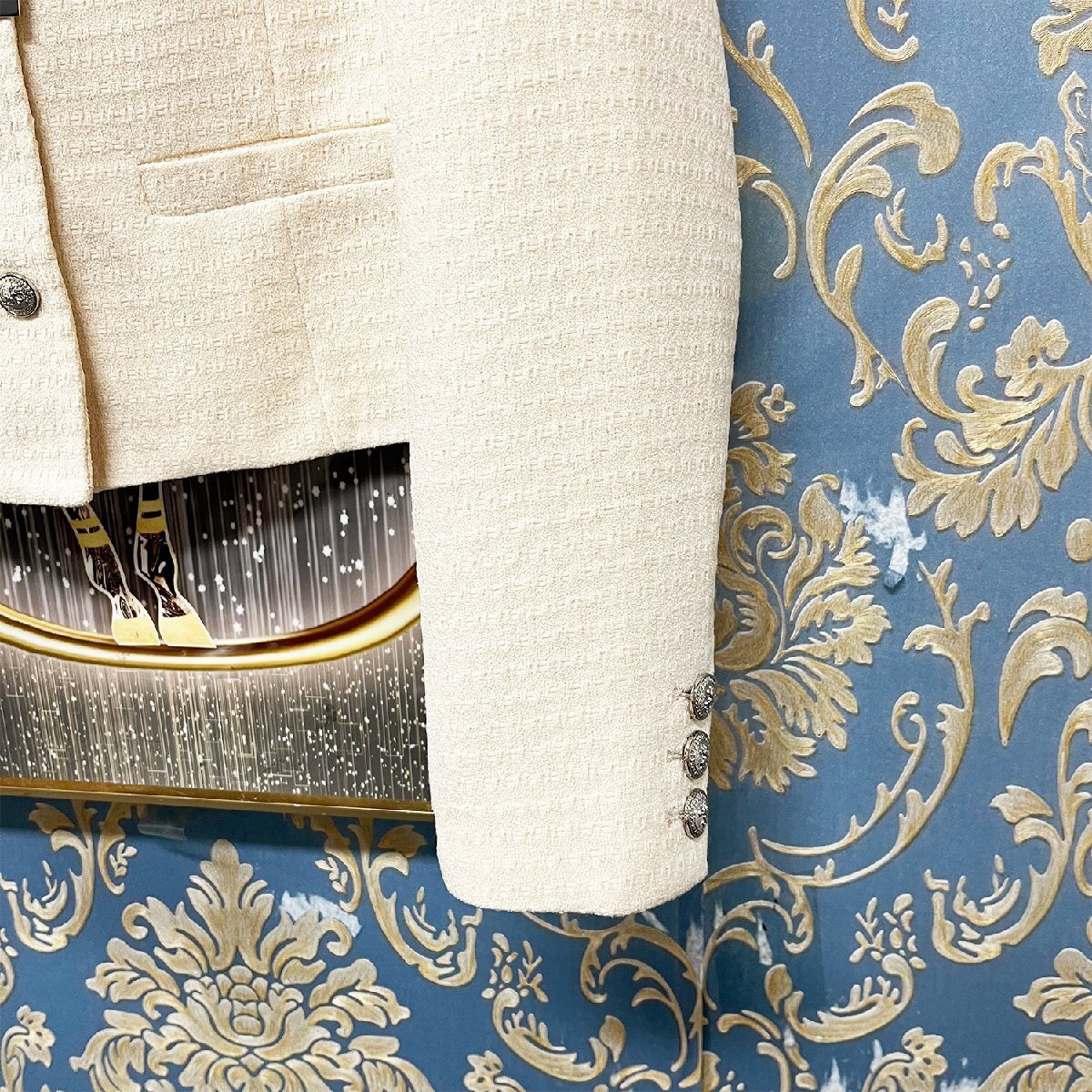 シルエットは女性らしいエレガントなラインを強調しており、カジュアルからフォーマルまで幅広いシーンで活躍する一着です。着丈が長すぎないショート丈なので、ボトムスを選ばすバランス良くコーディネートできます。