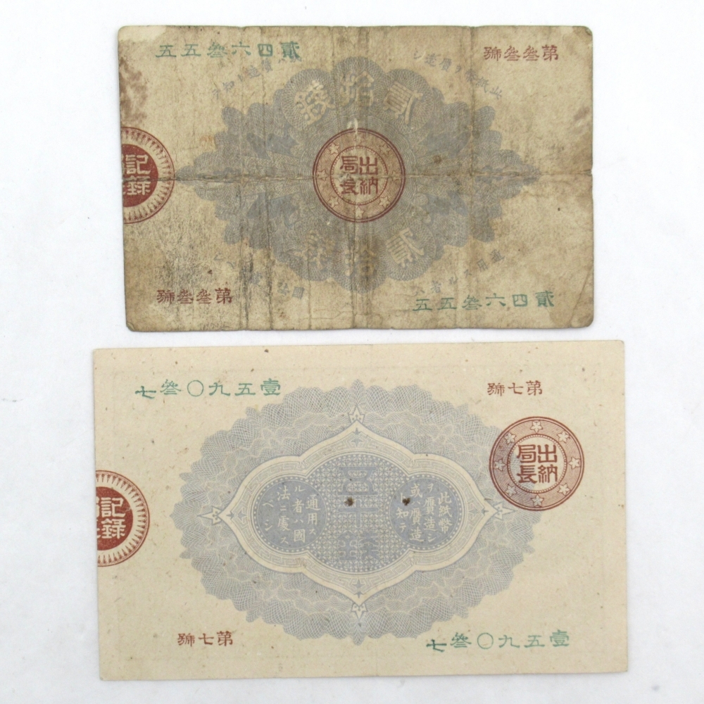 1円〜 改造紙幣五拾銭 大蔵卿50銭 /改造紙幣貮拾銭 大蔵卿20銭 大日本帝国政府紙幣 計2点 古紙幣 古札 3971212