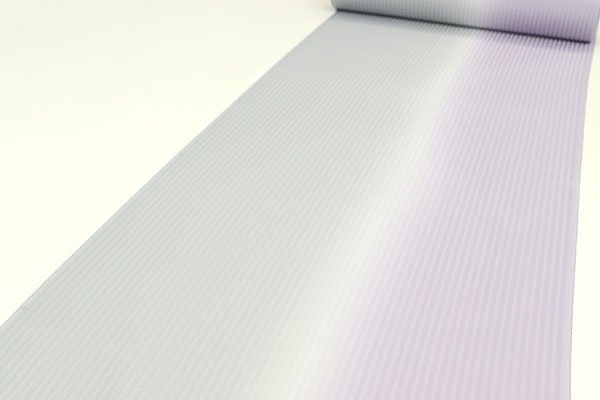 しっとりとした上質な丹後ちりめんの生地は、薄グレー、淡藤色のお色目でぼかし染めされております。生地には縞の地紋が織り込まれており、やや光沢感がございます。
