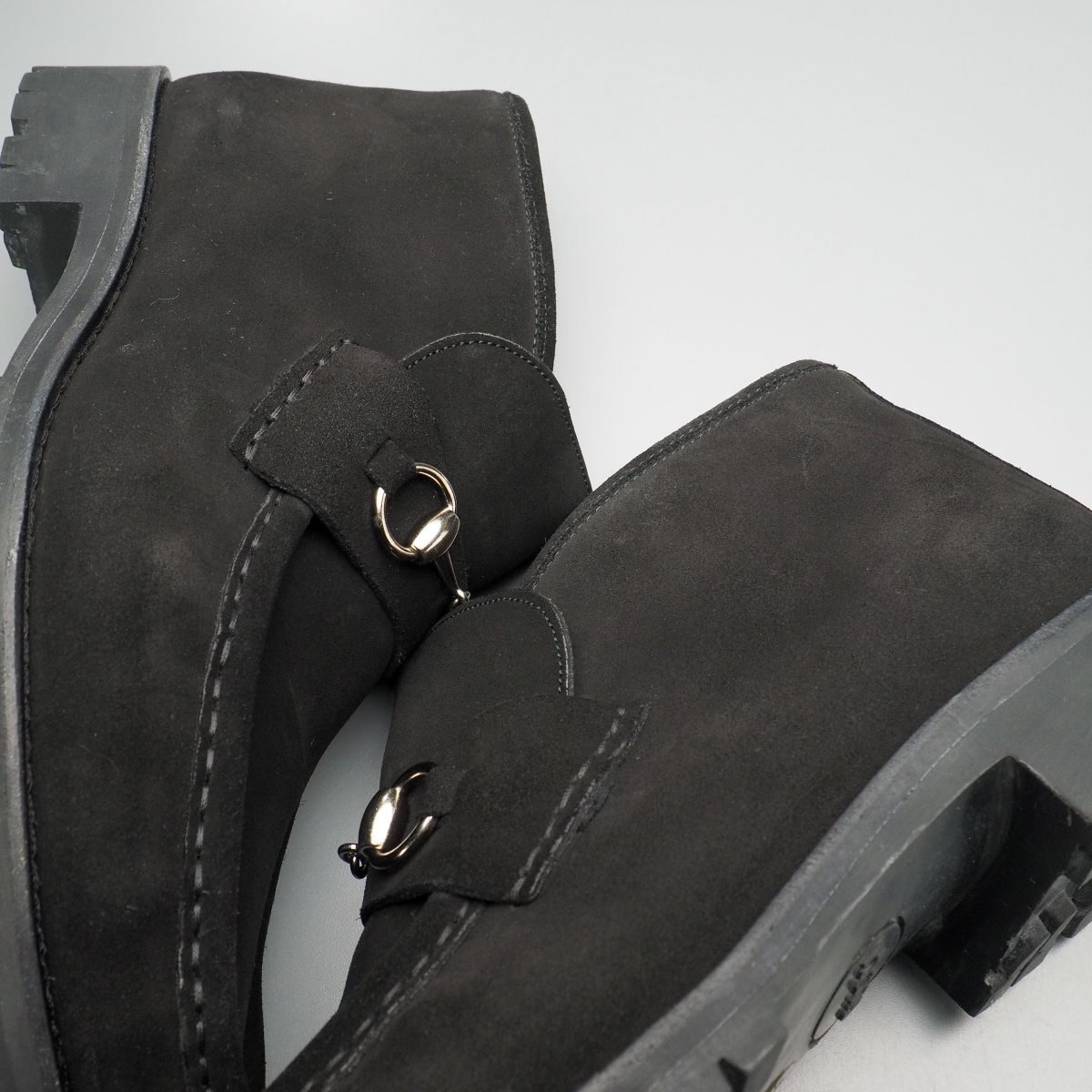 黒のスウェードレザーをアッパーに用い、アイコニックなホースビットの意匠を施したモカシンフロントのショートブーツ。