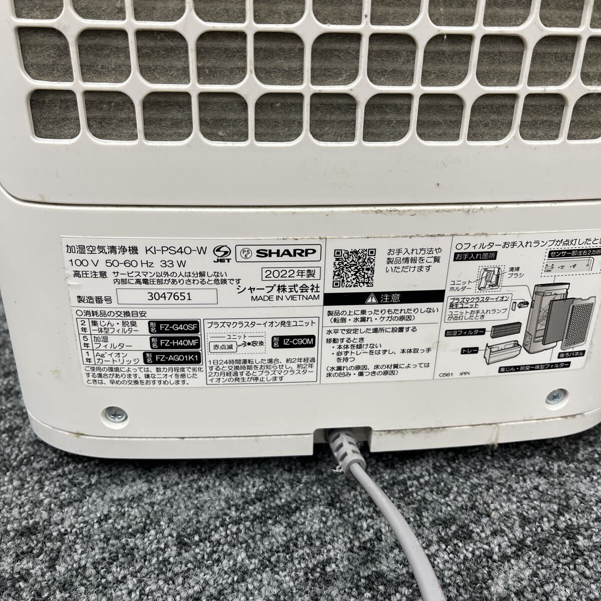 Product name: ◆ 【通電OK】※汚れあり※ SHARP シャープ 加湿空気清浄機 KI-PS40-W 2022年製 プラズマクラスター 現状品 OG9284 ☆お送り→140サイズ