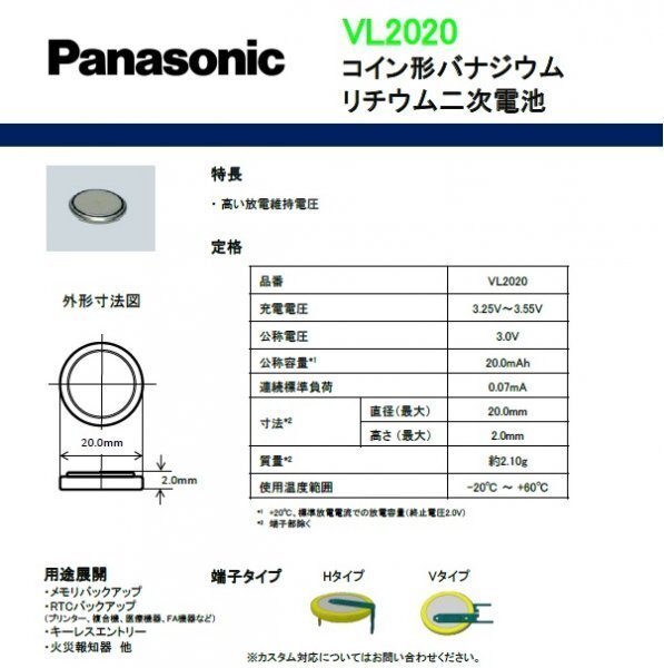 Product name: ★★【新品・即決・送料無料】パナソニック VL2020 HFN 105° VL系コイン形・タブ付リチウム二次電池 1個 [並行輸入 バルク品]★★
