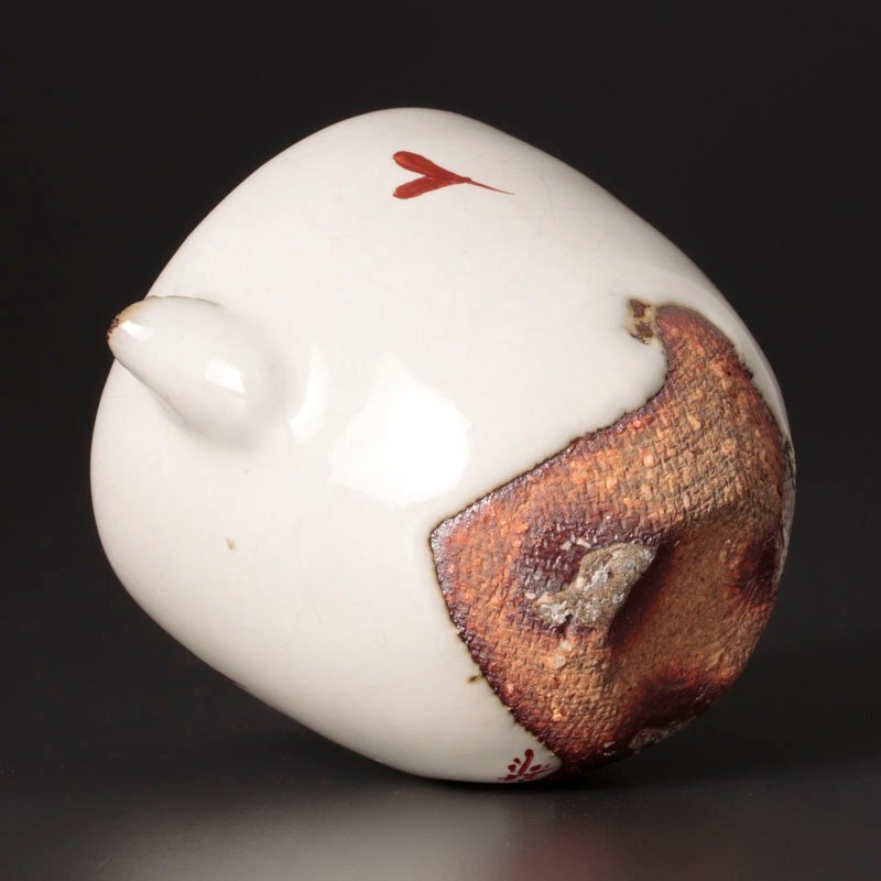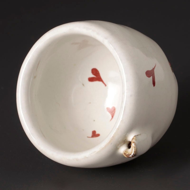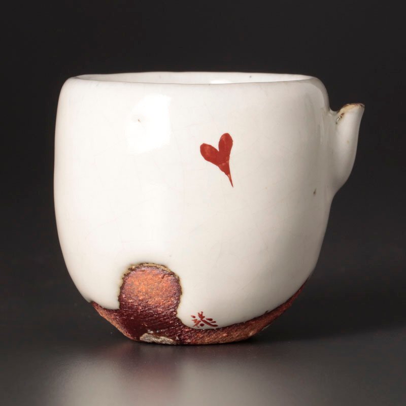 ぽってりとした白釉に赤いハートの模様が散りばめられ、注ぎ口を模した装飾が遊び心を感じさせる楽しい作品です。