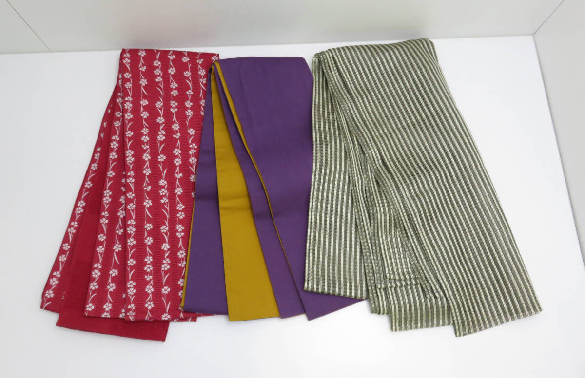☆和装小物 女性用 浴衣帯3本まとめ 赤系 花柄/紫×黄土色 無地 リバーシブル 兵児帯 グレー×ベージュ系 長尺 半幅帯 細帯 夏帯 現状品