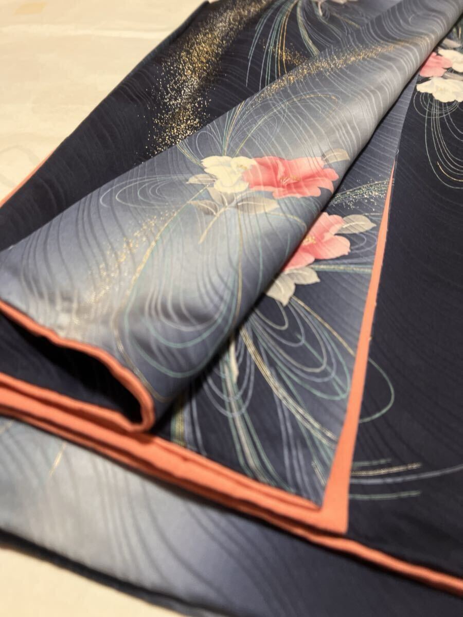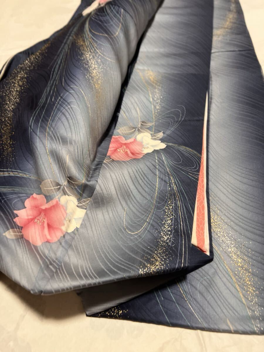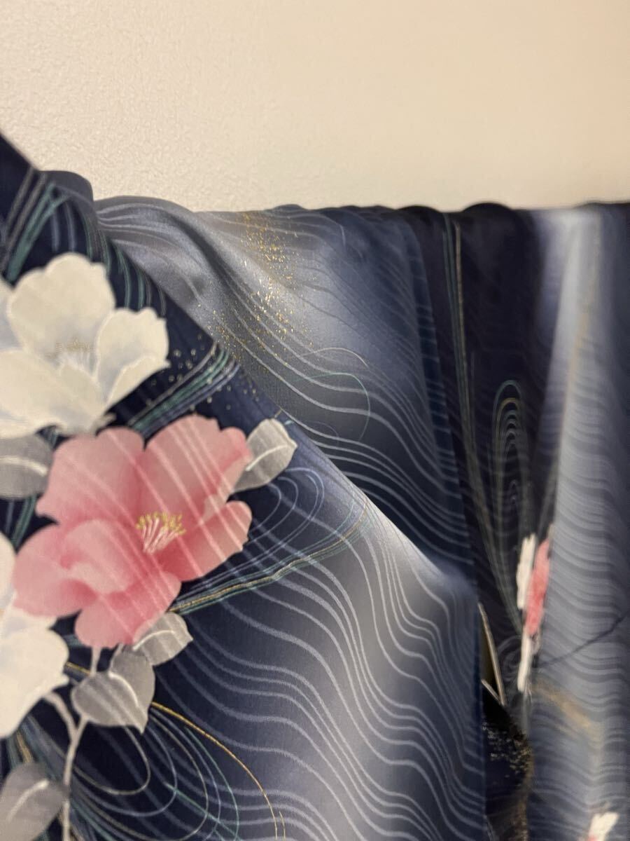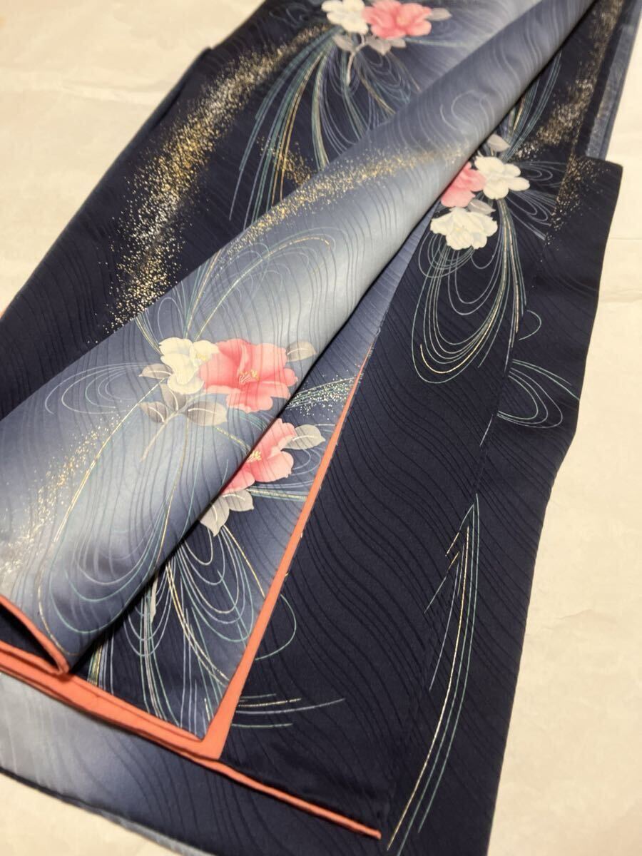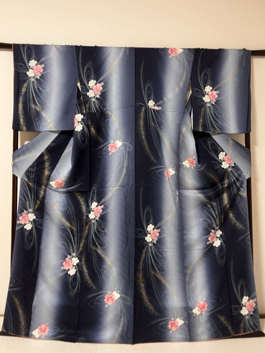着物 三松 着丈160cm 正絹 華 金彩 紺色系 小紋 きもの
