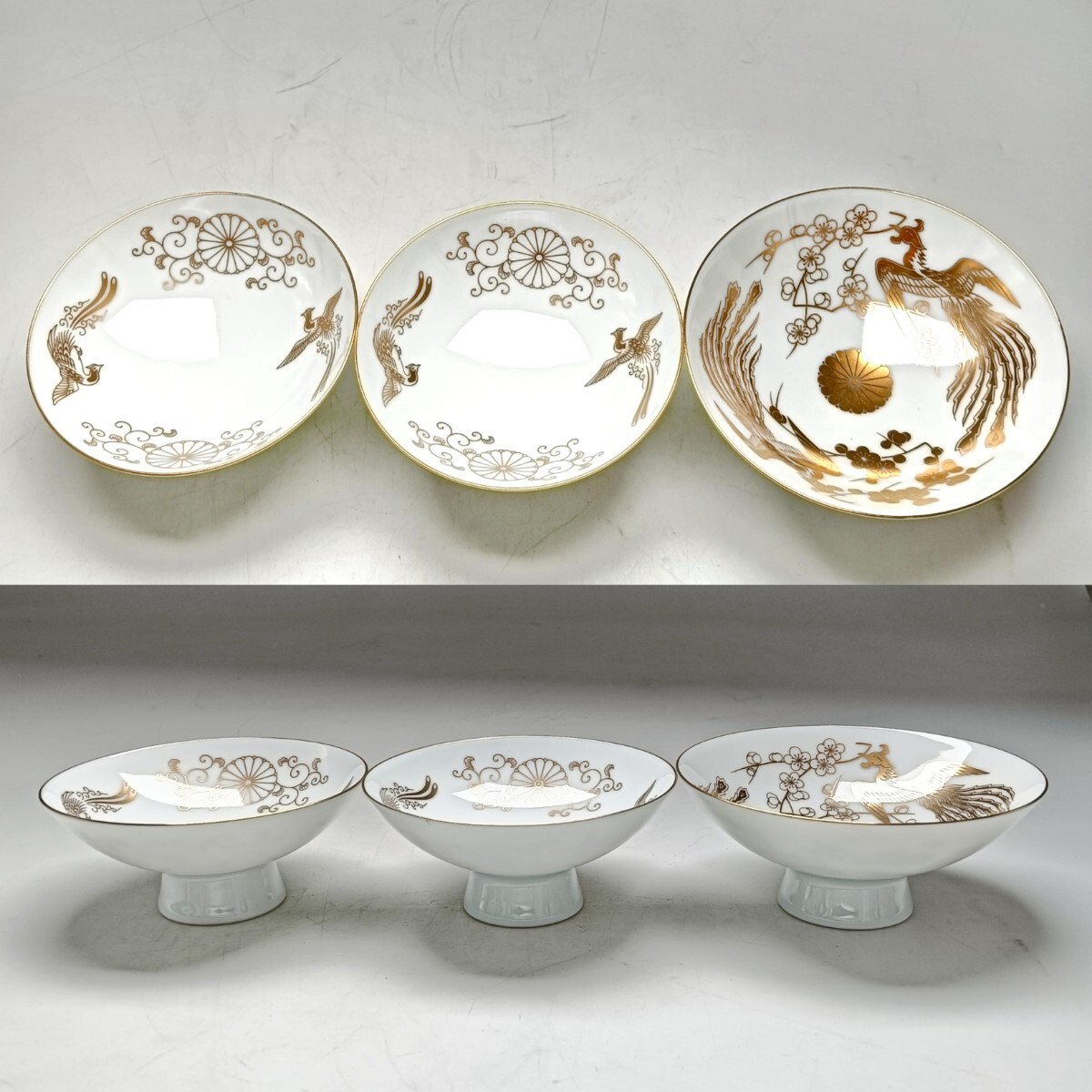 Product name: 【A4114】天皇家御下賜品 白磁金襴手 天皇家御菊紋に鳳凰文盃 三客まとめ 酒器 直径約9.5/10.5cm 古美術品 時代物