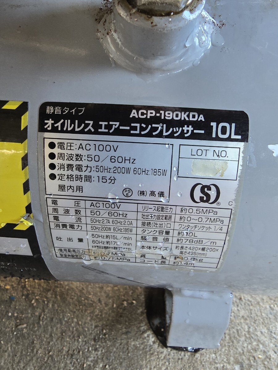 Product name: ㈱高儀 オイルレス エアーコンプレッサー 10L ACP-190KD 100V 50/60Hz 重量10.8kg 静音タイプ エアコンプレッサー