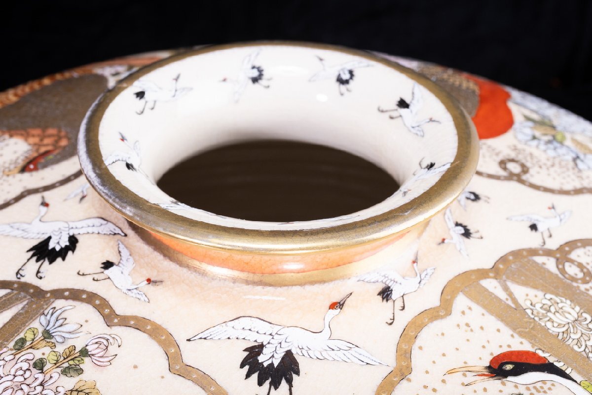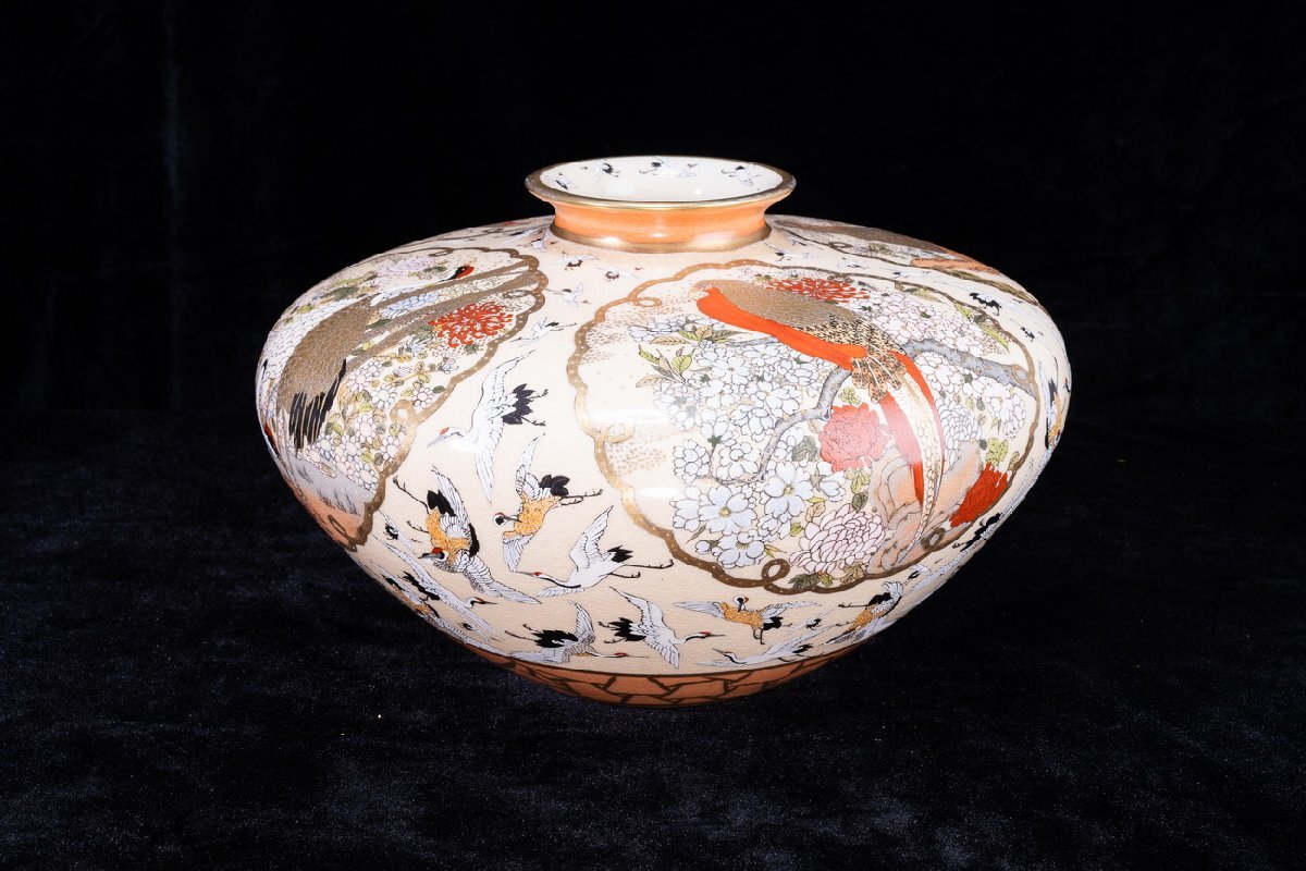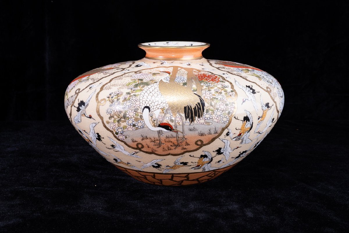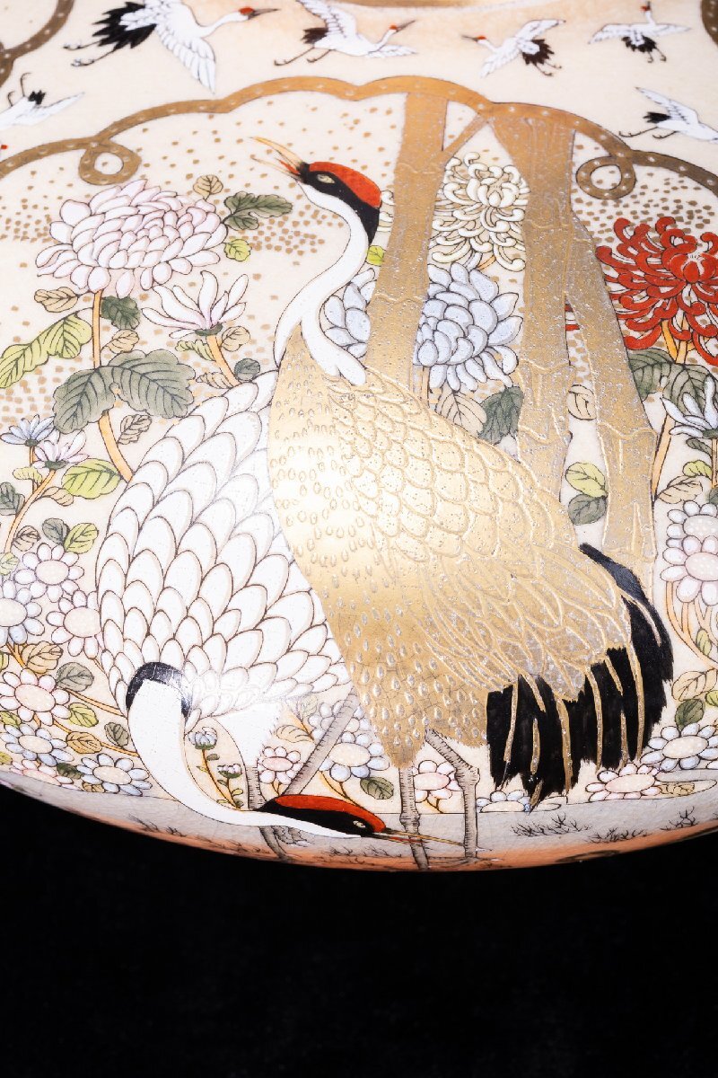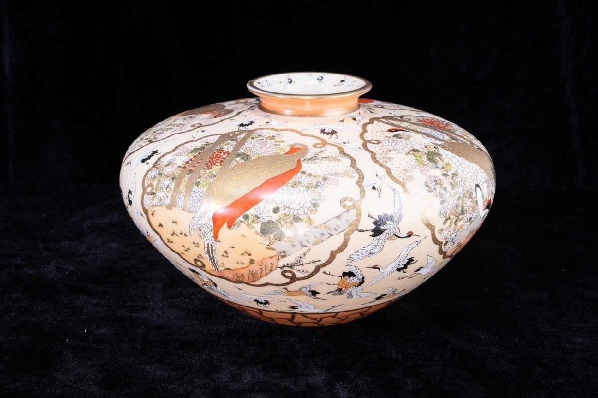 Product name: 【珍品堂】1円から M08-P05 薩摩焼 金彩 金襴手 群鶴図 飾壺 花瓶 座銘 高29cm 花器 花入 置物 日本陶器 骨董品 古美術