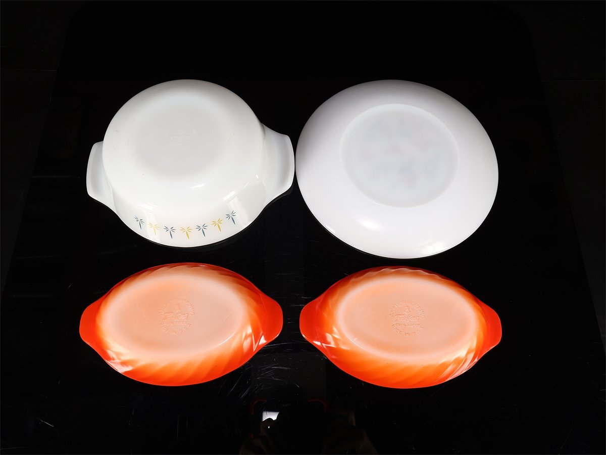 Product name: 【吉】CJ986 ファイヤーキング 【FIRE KING】 乳白ガラス 色絵 赤被せ プレート 耳付ボウル 4点 一括出品/美品!
