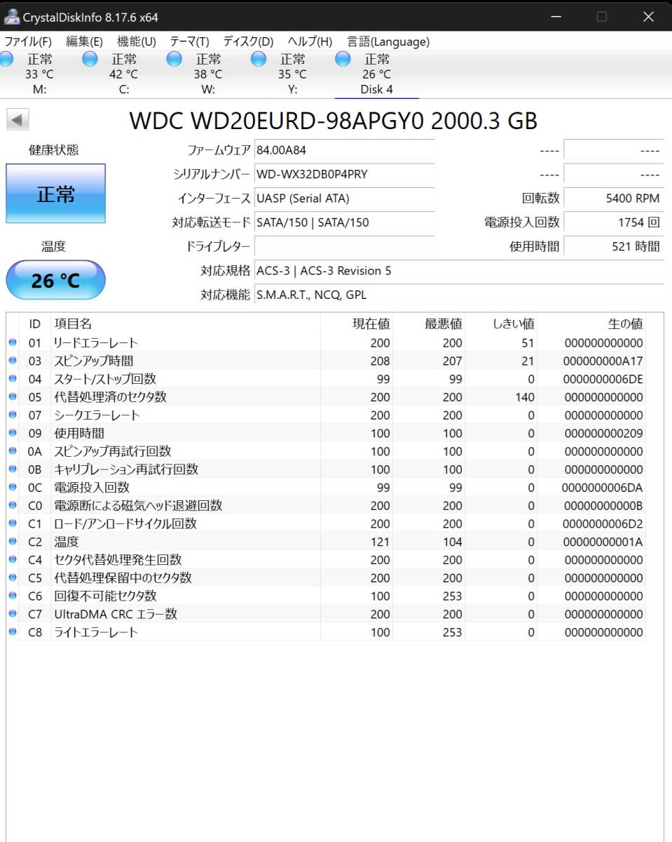 Product name: その6 WD20EURD 2台&東芝DT01ABA200V、DT02ABA200V 計2台 AVコマンド対応 合計2TB 4台 中古