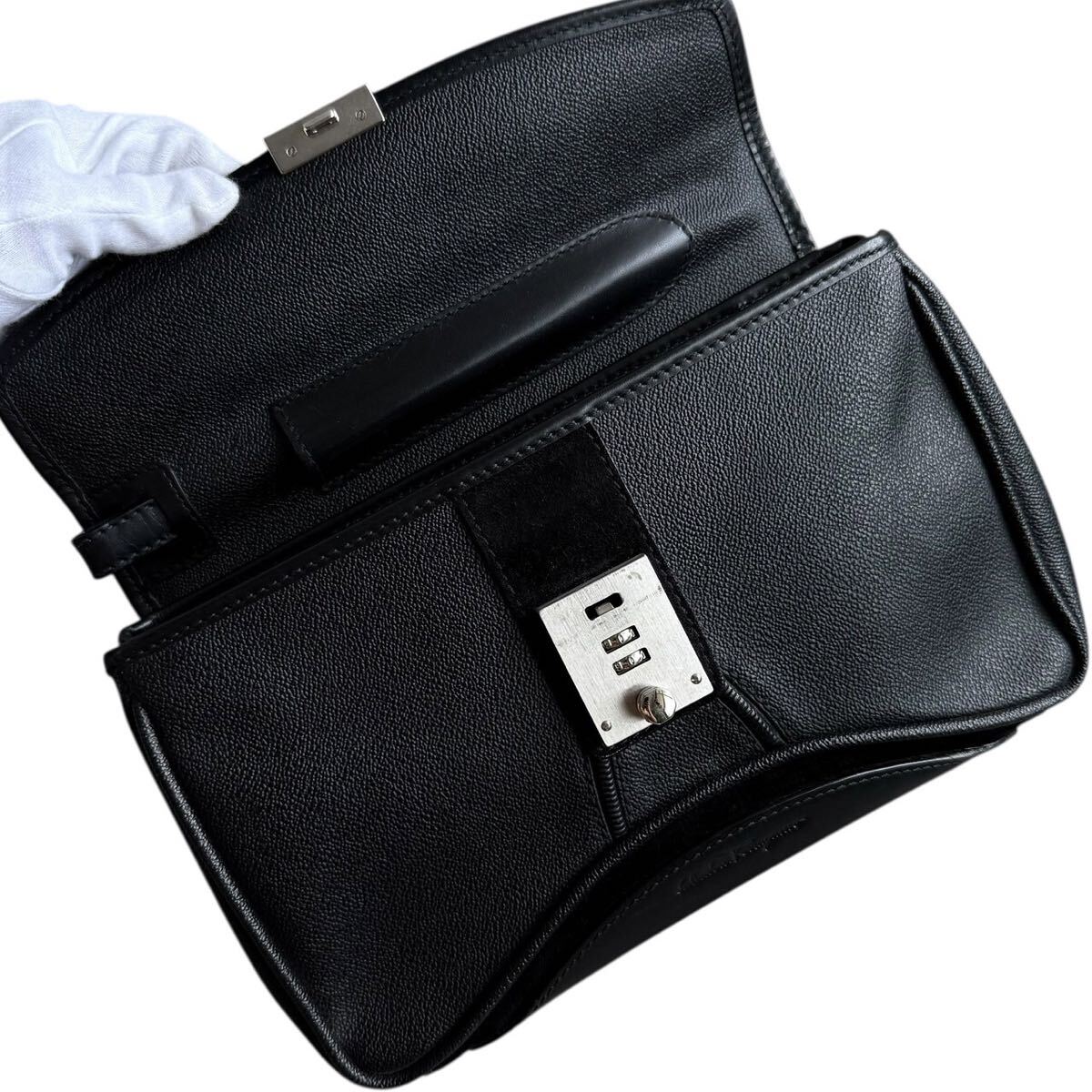 上質なカーフレザーとスエードレザー、PVCを組み合わせた重厚な質感が魅力で、フロントにはブランドを象徴するメタルロックがあしらわれています。ロックナンバーは「0-0」で設定されており、金具には繊細に刻まれたFerragamoロゴが輝きを添えています。さらに、フラップ下部には型押しロゴがさりげなく配置され、ブランドの威厳を静かに主張します。