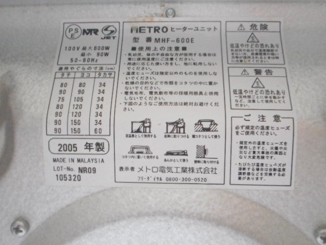 【送料無料】USED 中古・ こたつ用取替用、ヒーター本体のみ、600W、正方形約29cm、付ネジ付き、メトロ電気工業、動作