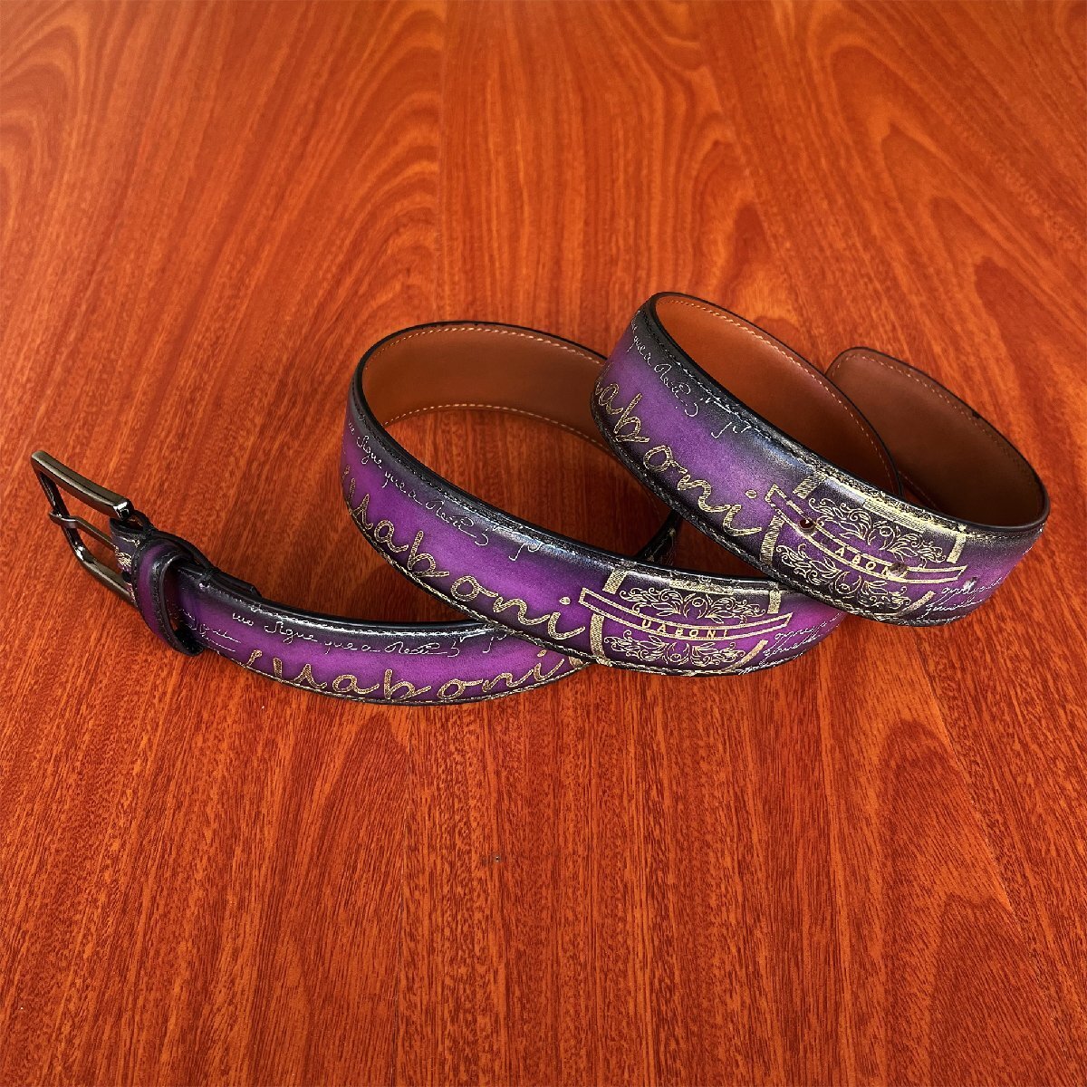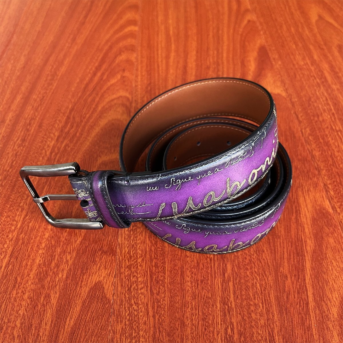 染料の開発成功は製作の一番重要な問題の解決に繋がり、職人が一つ一つの工程にこだわり作り上げた牛革ベルトです。一番こだわりの工程はカリグラフィーの彫り込みと革の着色です。