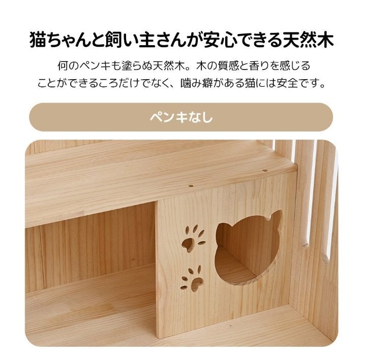 商品の説明: ◆01木製なので、お部屋のインテリアに馴染むやすいし、自然の温もりも感じられます。 ◆02透明感あるアクリルド板のドアで、いつでも猫ちゃんの生活と状態は見えます。 ◆03天板の耐荷重は10キロ以上で、収納棚としても利用可能。お気に入りの雑貨やペット用品をそのまま置けます。天板に置いたものは落ちないようにくれぐれもご注意ください ◆04多頭飼いOK!ゆとり空間。内部空間は広いで、中に猫トイレと猫皿が入られて、多頭飼いも窮屈しない、のんびりリラックスもできます。大きく開く扉を備えて、猫の出し入れも簡単。 ◆05登れる梯子とステップ台付き 猫ちゃんが登りやすい梯子とジャンプできるステップも用意し、猫ちゃんがケージにいっても運動できます。運動不足の解消やストレス発散に効果あります。 ◆06可愛い隠れ家 狭い所が大好きの猫ちゃんのため、可愛い猫ハウス二つを用意!15*15.5cmの挟まないサイズで、隠れつつも中から外の様子を確認することができます。 ◆07両側にある換気口 幅3cmの換気口は両側にも六つがあり、通気性がよくて夏も快適できます。 ◆08便利なキャスター付き 移動ラクラク~お手入れ簡単~キャスターはストッパー付きなので、止まるや移動も便利です。ケージの下のお掃除をする時も簡単に動かせます。キャスターは自分の都合によって、お好みに取り付けます。 ◆09 取っ手とロック 取っ手付きで、ドアを開閉する時が便利です。 ◆10 猫ちゃんと飼い主さんが安心できる天然木 何のペンキも塗らぬ天然木。木の質感と香りを感じることができるころだけでなく、噛み癖がある猫には安全です。 ◆11 木版は天然木が直接切断加工されるものですので、接着剤は一切ありません。ホルムアルデヒドの発生源としての接着剤は使いませんので、ホルムアルデヒドは含みません。商品が到着した後、木の味がある恐れがあります。空気の流通がいい所に置くのがお勧めします。 ◆12優れた耐衝撃性があり、もし割れたとしてもて飛び散る事も少ないので、ガラスに比べて割れた後のケガの心配はありません。