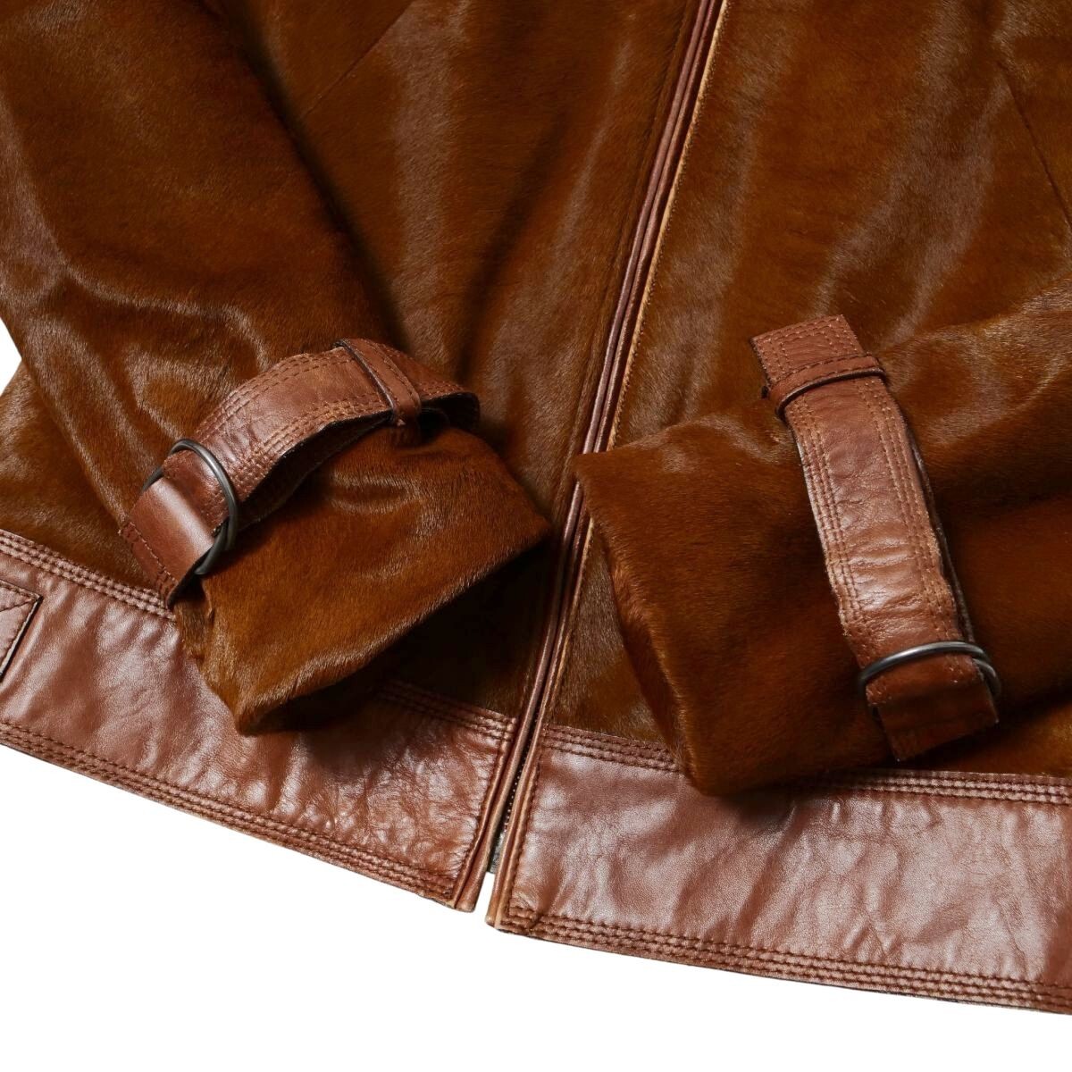 上質なハラコレザーを使用しており、独特の光沢と存在感が魅力の一着です。ブラウン系の落ち着いたカラーで、カジュアルにもきれいめにも合わせやすいデザインです。