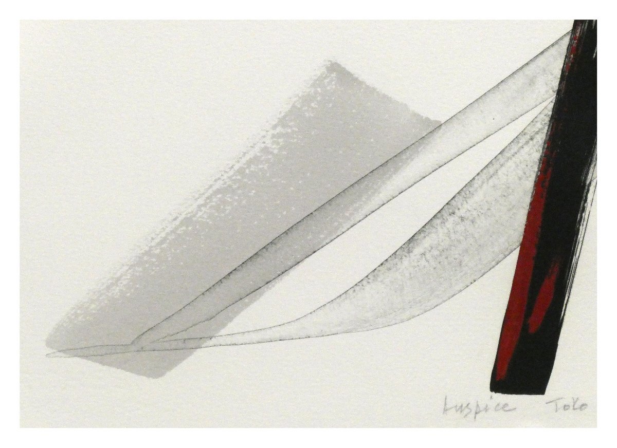 洗練された線は間を構成し、面と線は寄り添い、墨は静かに鋭く、あるいは控えめに層をなしています。