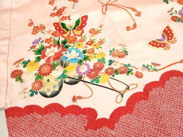 産着【表地:正絹・胴裏:化繊、襦袢:化繊】の状態は接写画像のように祝着と襦袢の表地所々・胴裏所々に薄い汚れがございます。