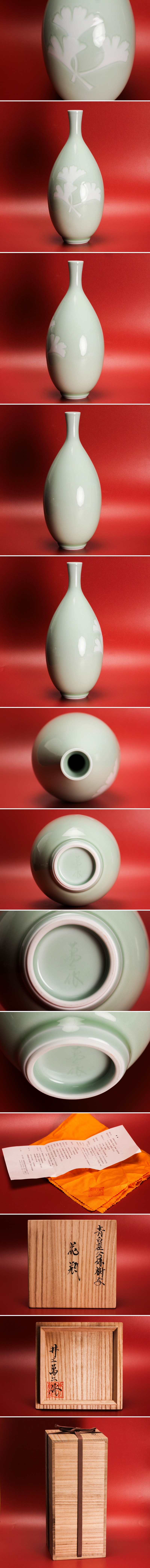 Product name: 人間国宝 井上萬二 高さ30.5cm 青白磁公孫樹文花瓶 共箱 共布 栞 本物保証