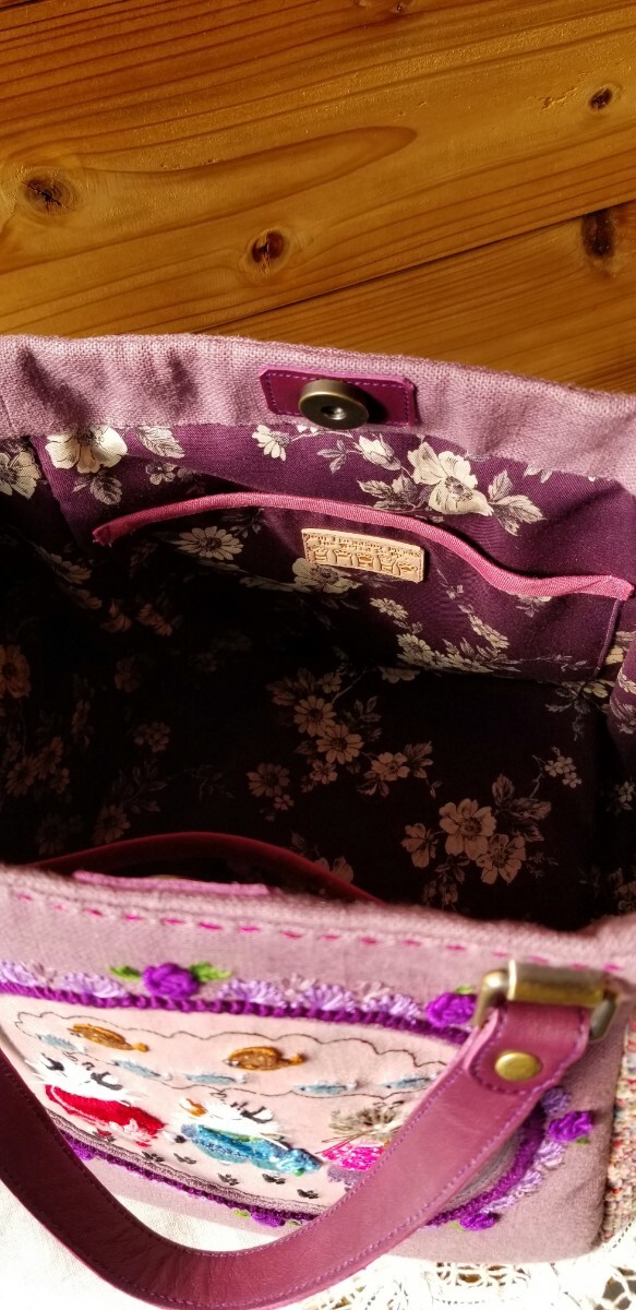 パープルカラーの厚手リネンとインポートクロスを合わせて、マチたっぷりのスクエアバッグを制作いたしました。