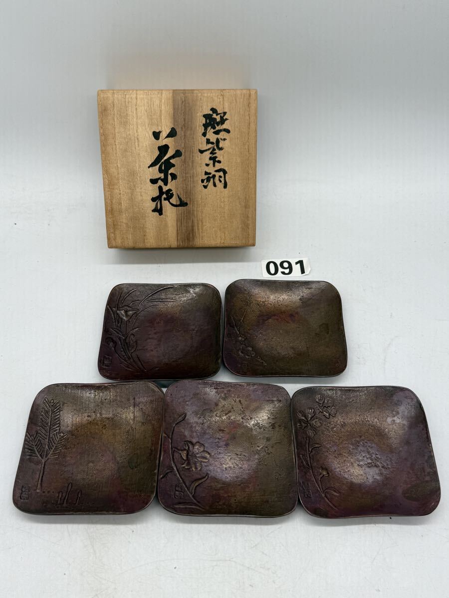 No.91 明宮作 銅製茶托 五客揃 山茶花文 共箱付 茶道具 茶托 銘々皿 和食器 角皿 金属工芸 煎茶道具 茶器 在銘 五客