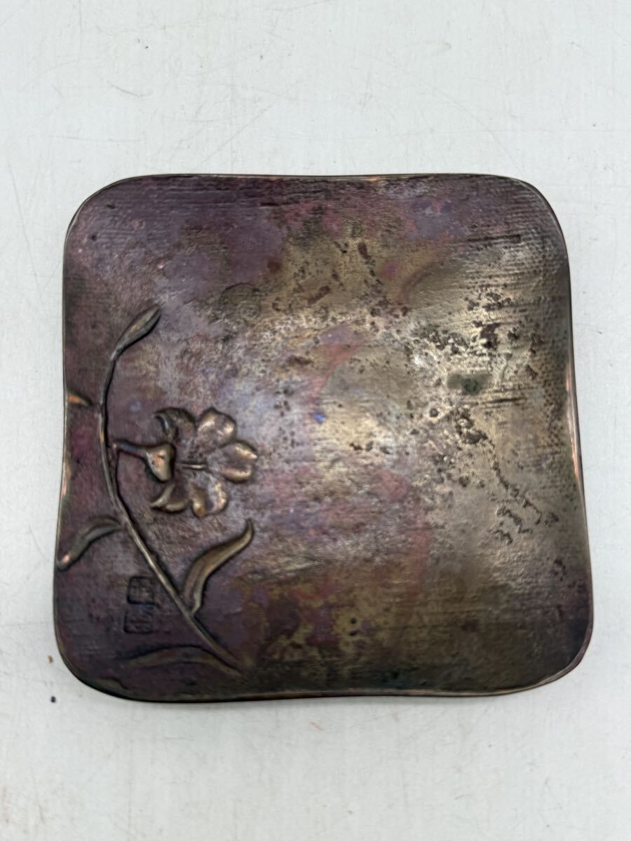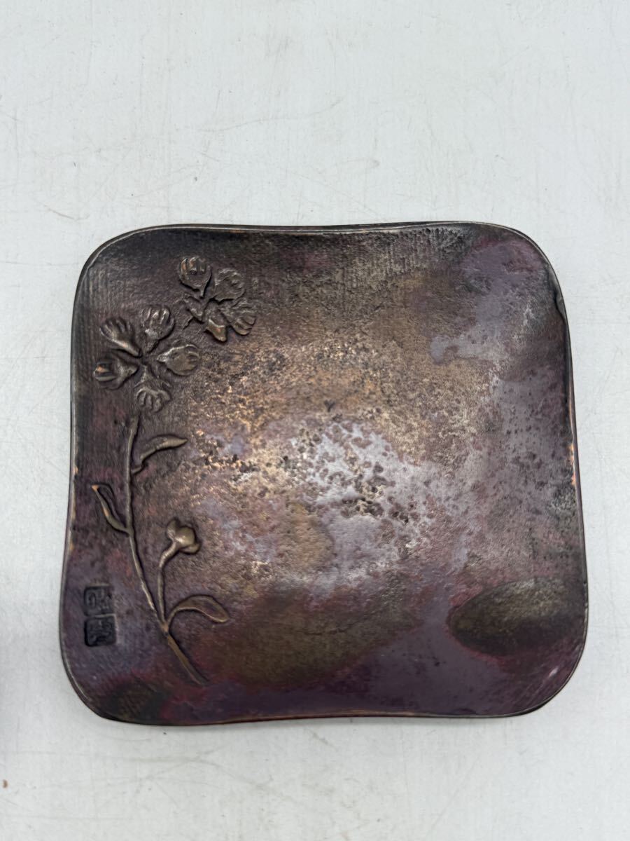Product name: No.91 明宮作 銅製茶托 五客揃 山茶花文 共箱付 茶道具 茶托 銘々皿 和食器 角皿 金属工芸 煎茶道具 茶器 在銘 五客