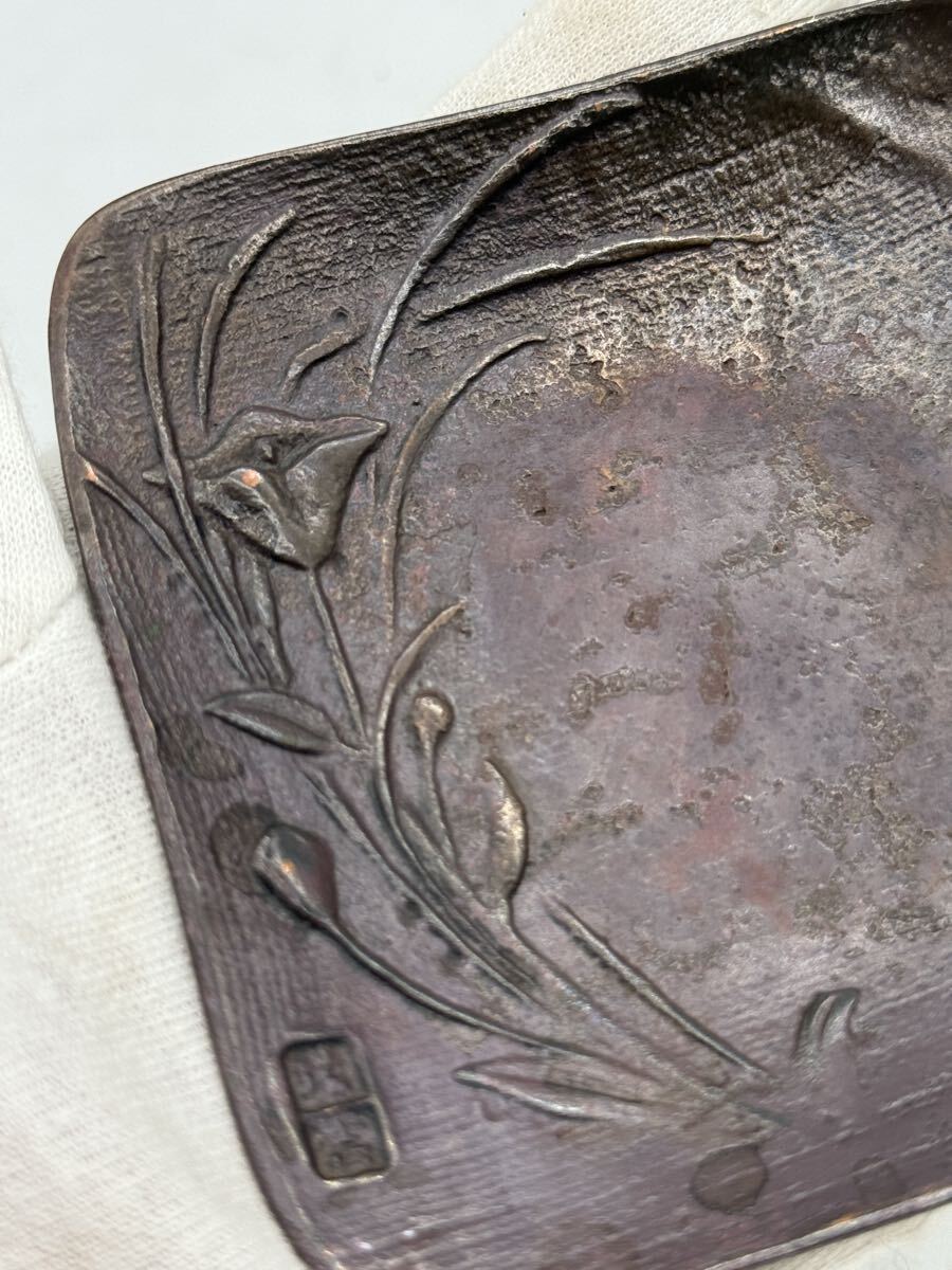それぞれに異なる植物文様が表され、重厚な古銅色の風合いと時代の趣を感じさせる逸品。