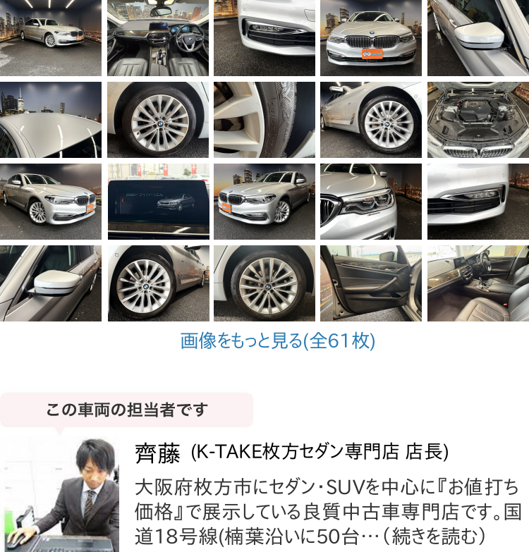 K-TAKE枚方店は国産セダン・SUV・ステーションワゴンを中心に取り扱いしております。趣向性の高い車種になりますので、専門知識を持ったスタッフにてご案内させて頂きます。コーティングやカスタム等はもちろん、任意保険、オートローンまで安心のカーライフをお約束致します。整備、保証などのアフターサービスも当店ですべて行えますのでご安心ください。当社は全国のオークション会場、約160カ所と業務提携を結んでおります。全国60000台以上の中古車を当店でご商談、ご契約、ご納車可能です!