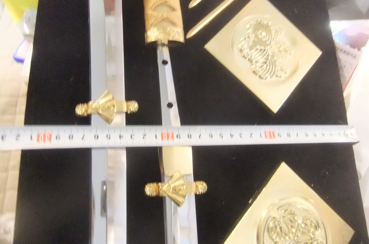 Product name: 美品  三代家紋(徳川、織田、豊臣)があしらわれた日本刀の模造刀と刀装具のセット 額縁なし