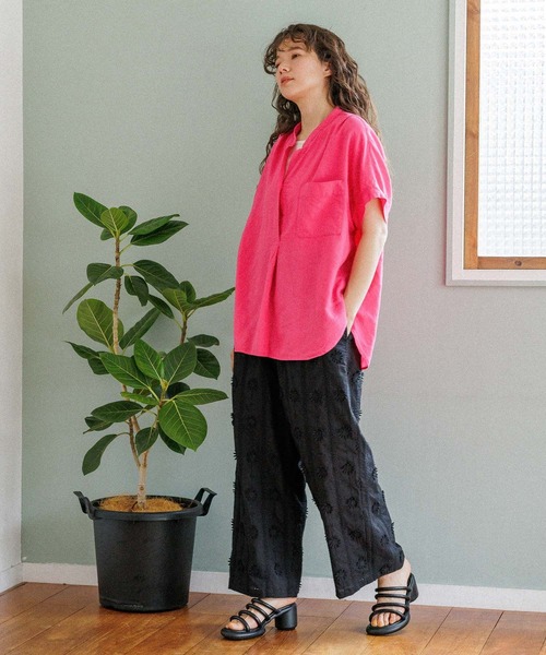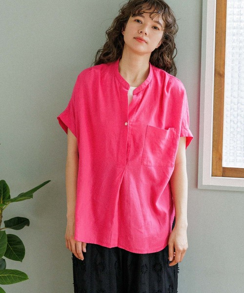 キーワード:ブラウス シャツ レディース ノーカラー ノースリーブ リネン 麻 無地 夏 春