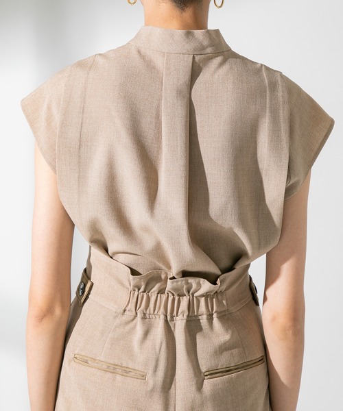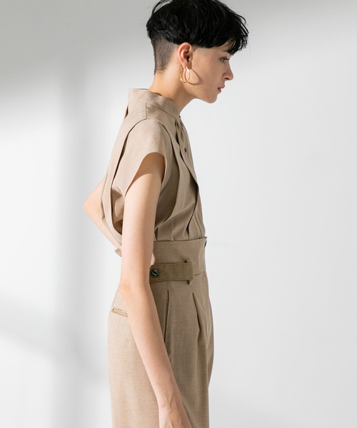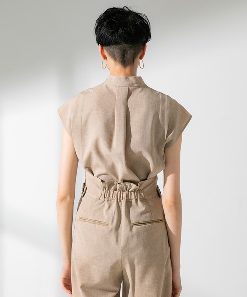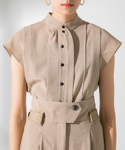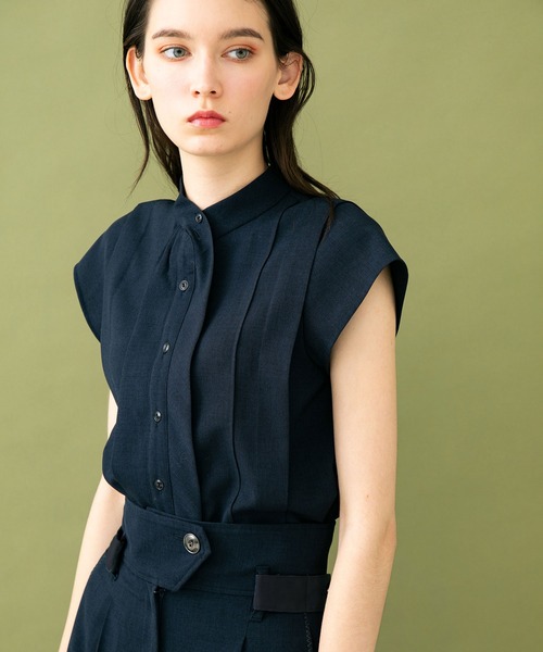 キーワード:ブラウス シャツ レディース サテン スタンドカラー 半袖 無地 夏 春