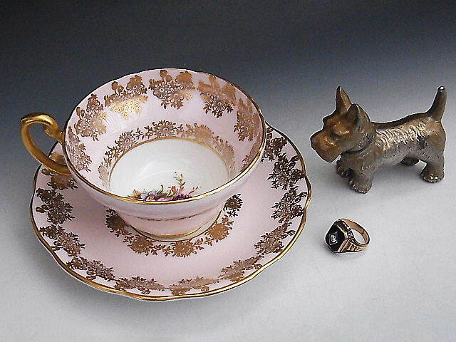 英国フォーリーボーンチャイナ(E. BRAIN & Co. LTD)の全体を淡いピンク色のカップ&ソーサーです。 ご覧のように金彩でたくさんの花文様を配し、見込部分には卓越した手描きで花ブーケが描かれています。 状態はほぼ完全美品です。 年代は裏印より1948年~1963年の間の作品です。 大きさはカップの直径が9㎝、縁からの高さが5.5㎝、ソーサーの直径が14㎝ あります。 送料は2800円頂きます。 支払いはYahoo!かんたん決済、または銀行振込みでお願いします。 日本以外への海外発送も承ります。 ご入金確認後支払2日以内にアメリカより航空便でお送りいたします。 発送後通常4~10日でお届けいたします。 複数品落札の場合は送料をまとめて計算させて頂きますのでお得になります。 私共は経済産業省の定める特定商取引法を順守しております。 当方の所在地住所等は出品者の自己紹介情報欄をご覧ください。 ご質問等ございましたらお気軽にお問い合わせください。   他にもオールドノリタケを中心に沢山出品しておりますのでここをクリックしてご覧ください。