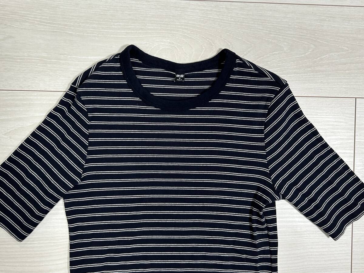 ★UNIQLO ユニクロ リブボーダー クルーネックTシャツ 5分袖 Mサイズ 紺★