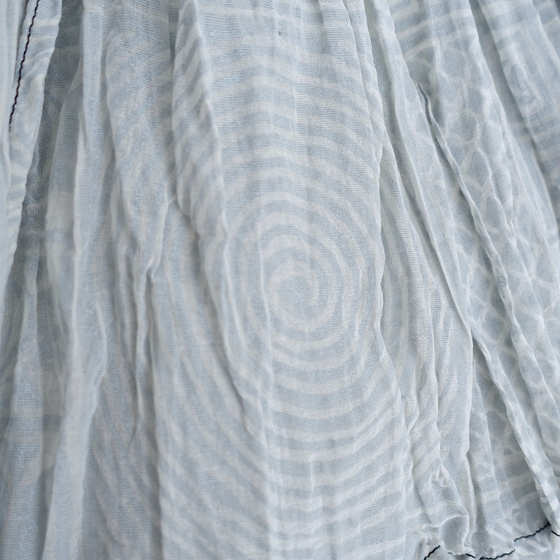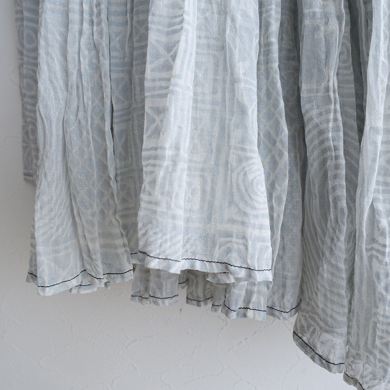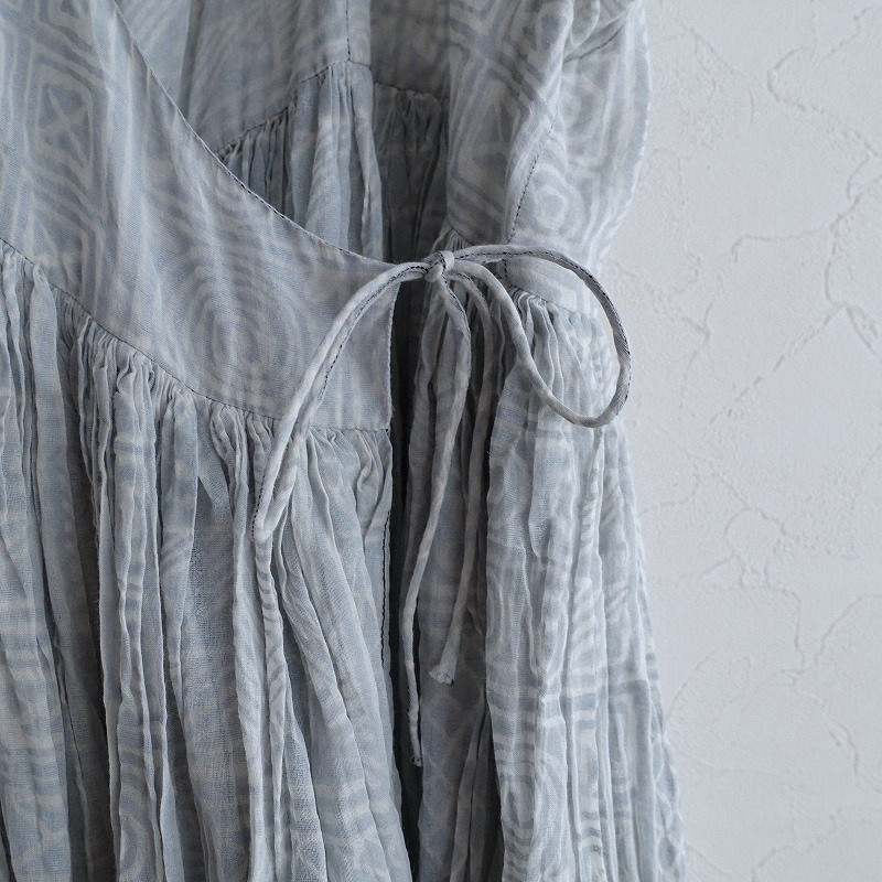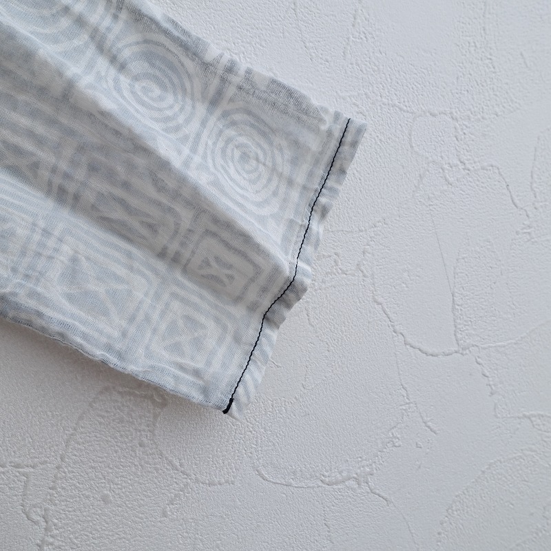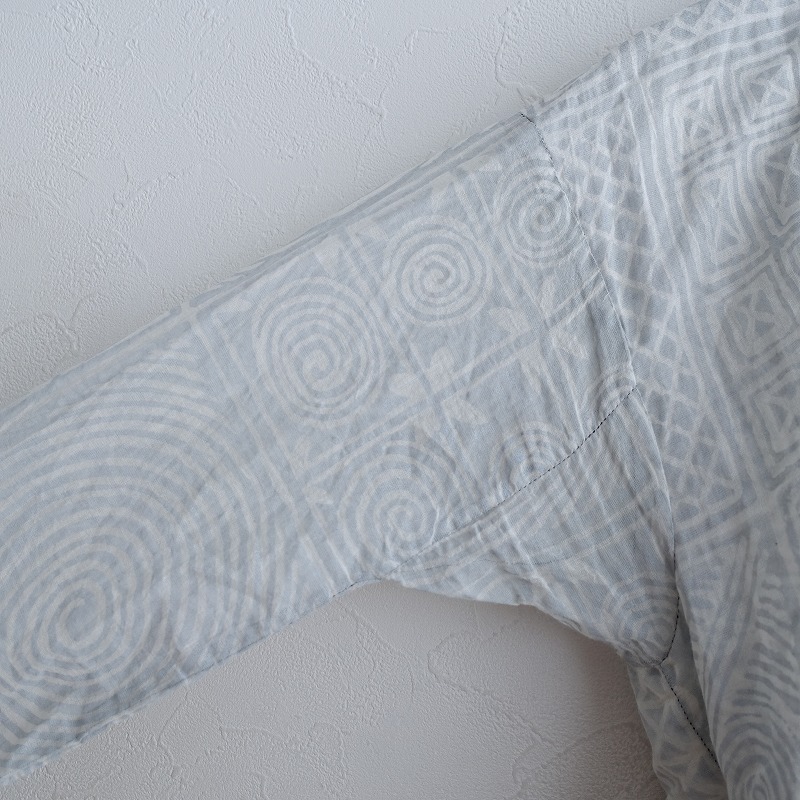 DOSAのプリントラバリジャケットです。カラーは、アイススモークブルー×ホワイトのブロックプリント風の柄があしらわれております。手紡ぎ・手織りのカディコットンのボイル生地を使用。透け感がございます。フロントはカシュクール仕様の左右腰紐留めです。たっぷり贅沢に生地を使ったギャザーが施されております。ポケットはございません。