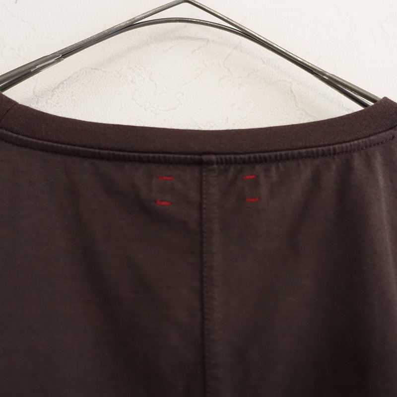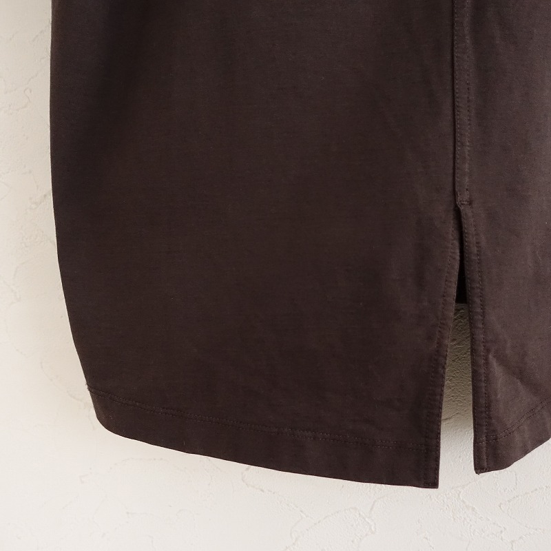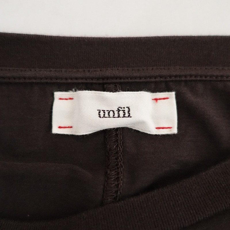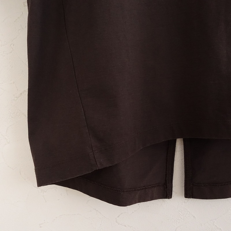 unfilのバックスリットカットソーです。カラーはダークブラウンで、ややストレッチ性のある天竺のような素材です。プルオーバータイプで着脱でき、襟ぐりはリブ仕様です。後ろ裾にセンタースリット入りで、後ろ裾丈が長めです。定価(メーカー希望小売価格)12,100円の商品です。