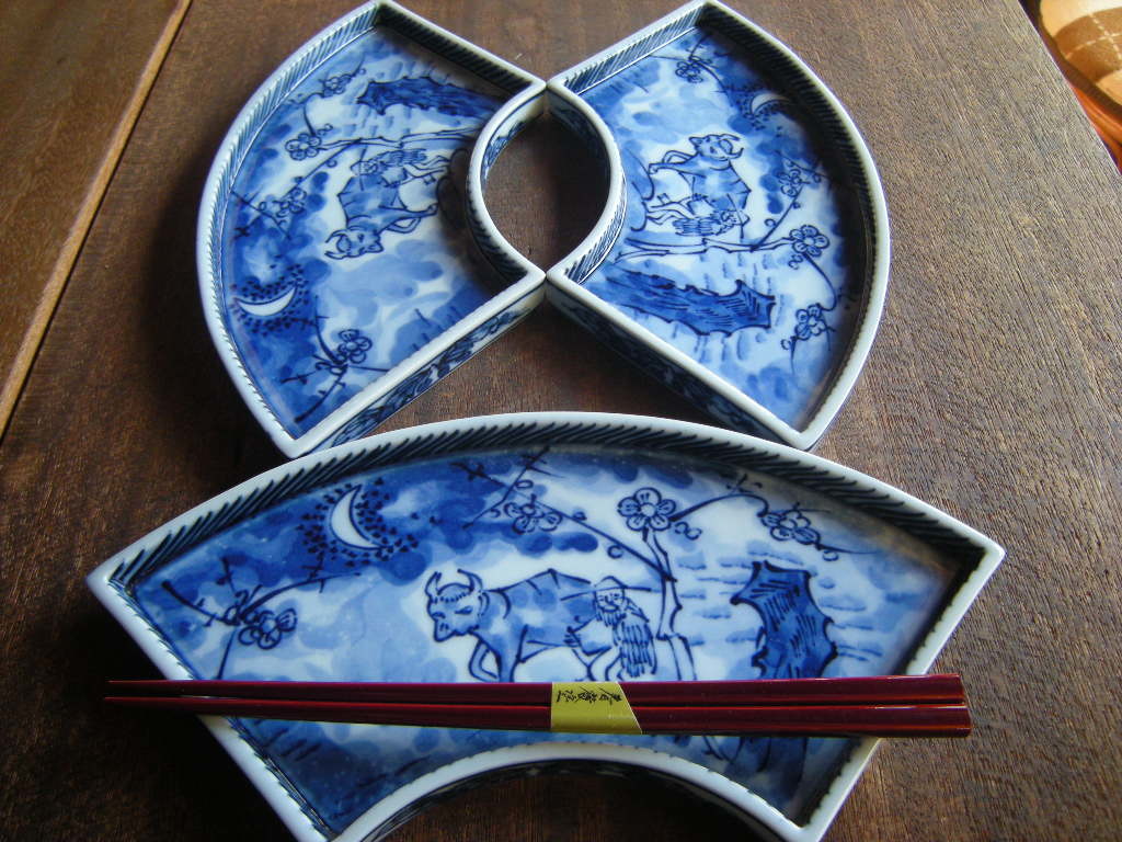 料亭うつわ◇在庫限り【新品*廃番】染付 牛飼い 扇皿 盛付皿(27㎝x13㎝x2㎝)1枚から *高級うつわ*掘り出し物*廃番商品*