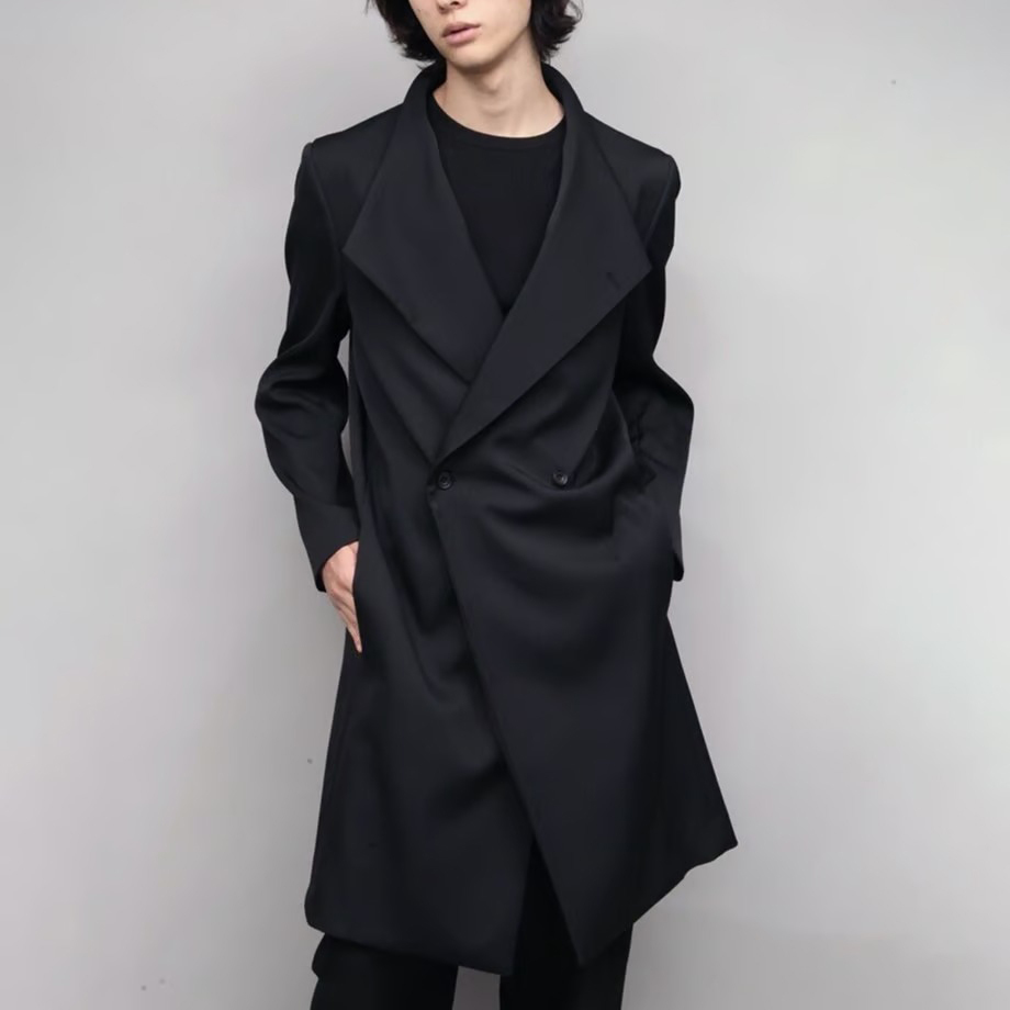 立ち襟と大きいラペルで前の開け閉めにより表情が変わるデザイン