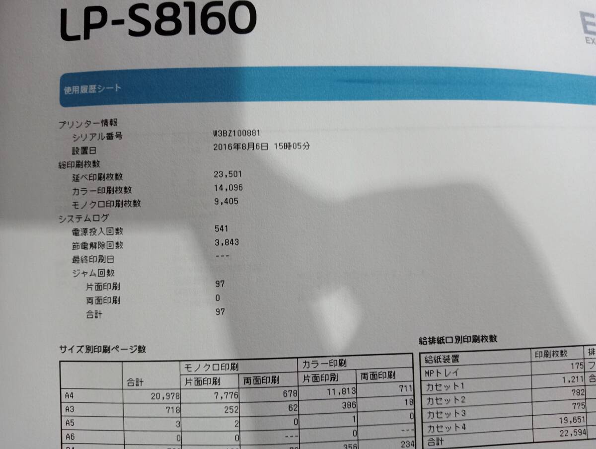 EPSON エプソン LP-S8160の出品になります。希少な3段給紙つきになります。カウンター枚数も23,501枚は少なめで魅力的です。