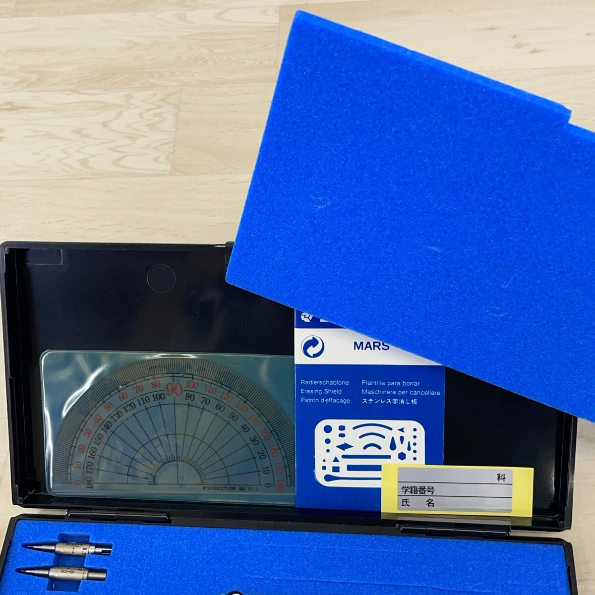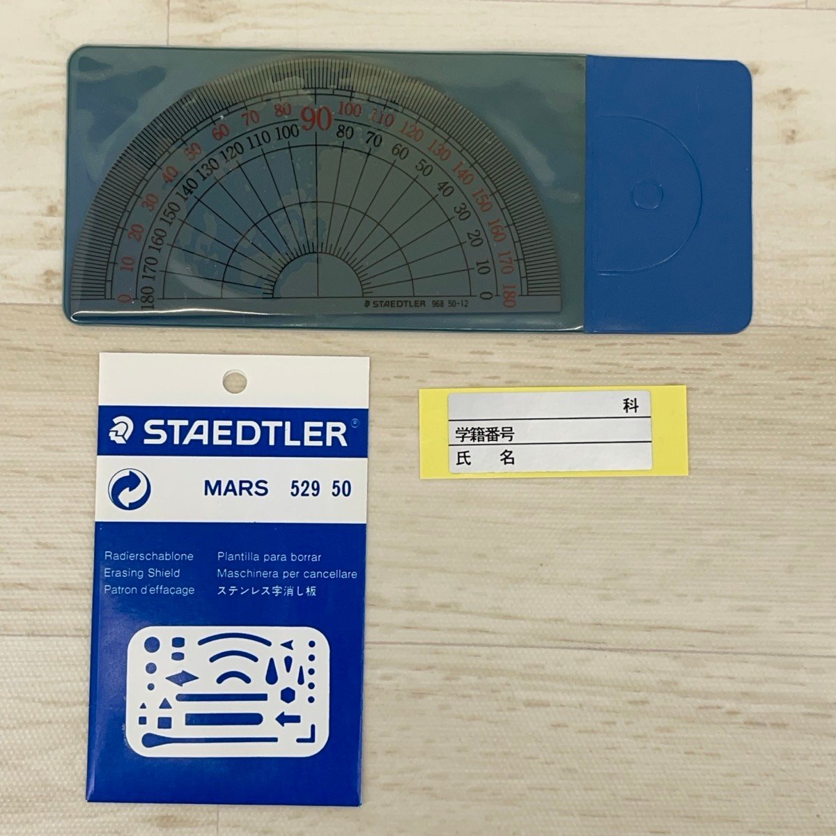 分度器・STAEDTLER・名前シールは、蓋にある青いスポンジの裏に収納されています。※画像10枚目をご確認ください。