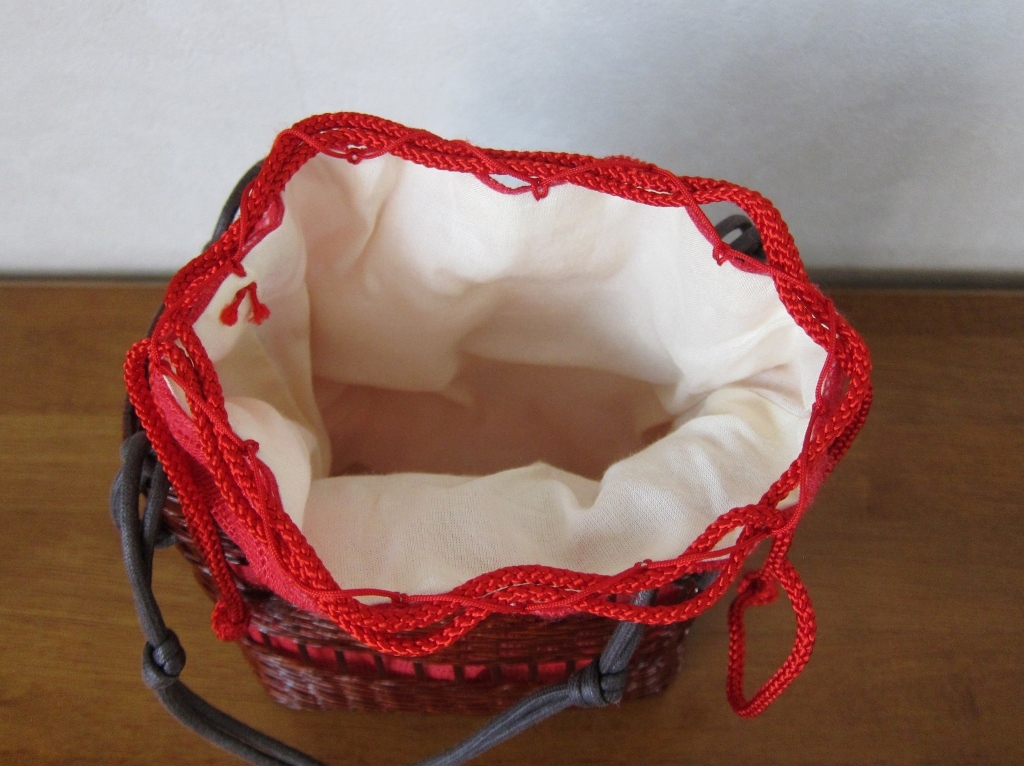 バッグは竹製のかごで、かごの中が見えないように巾着袋が付いています。