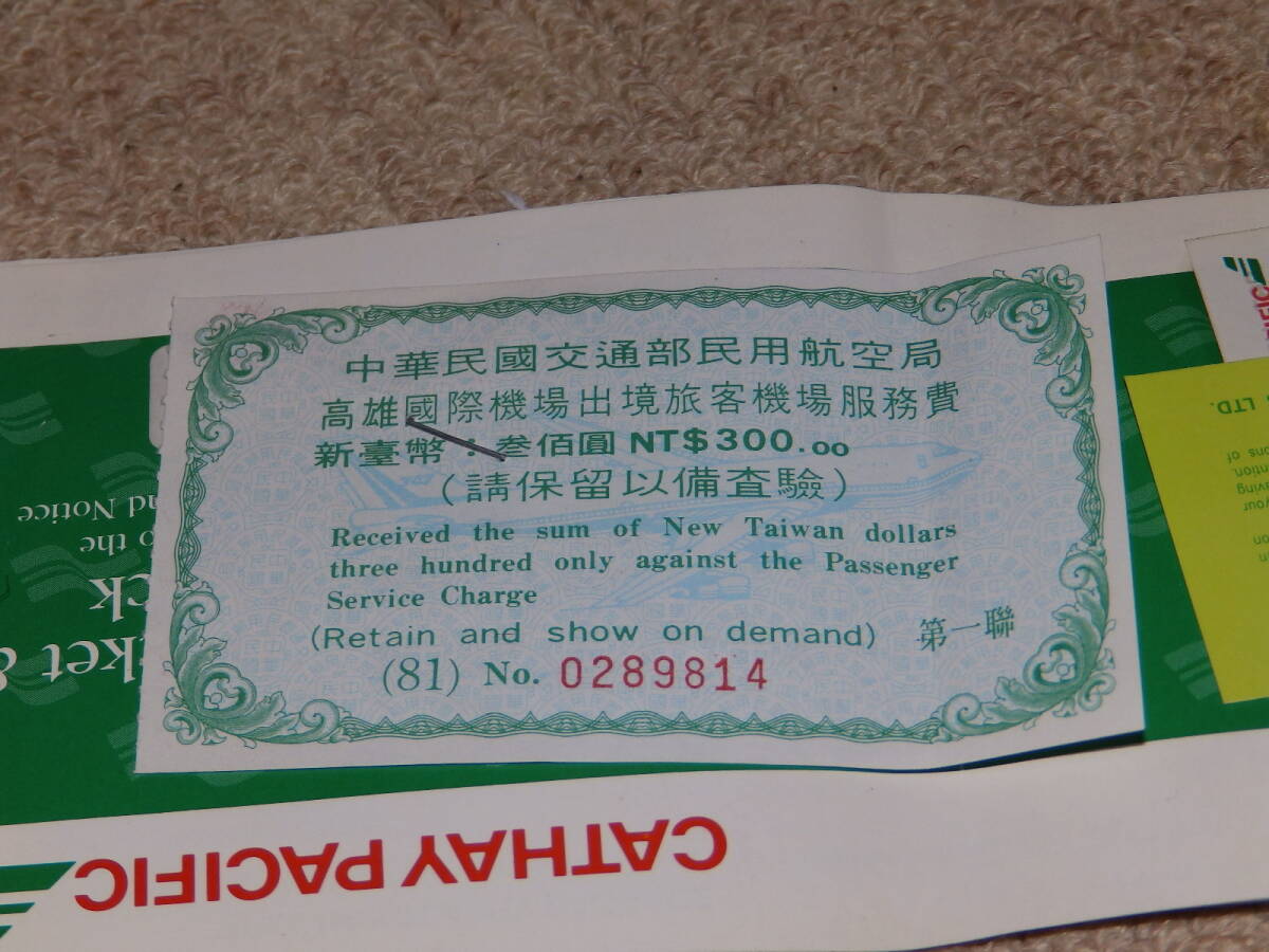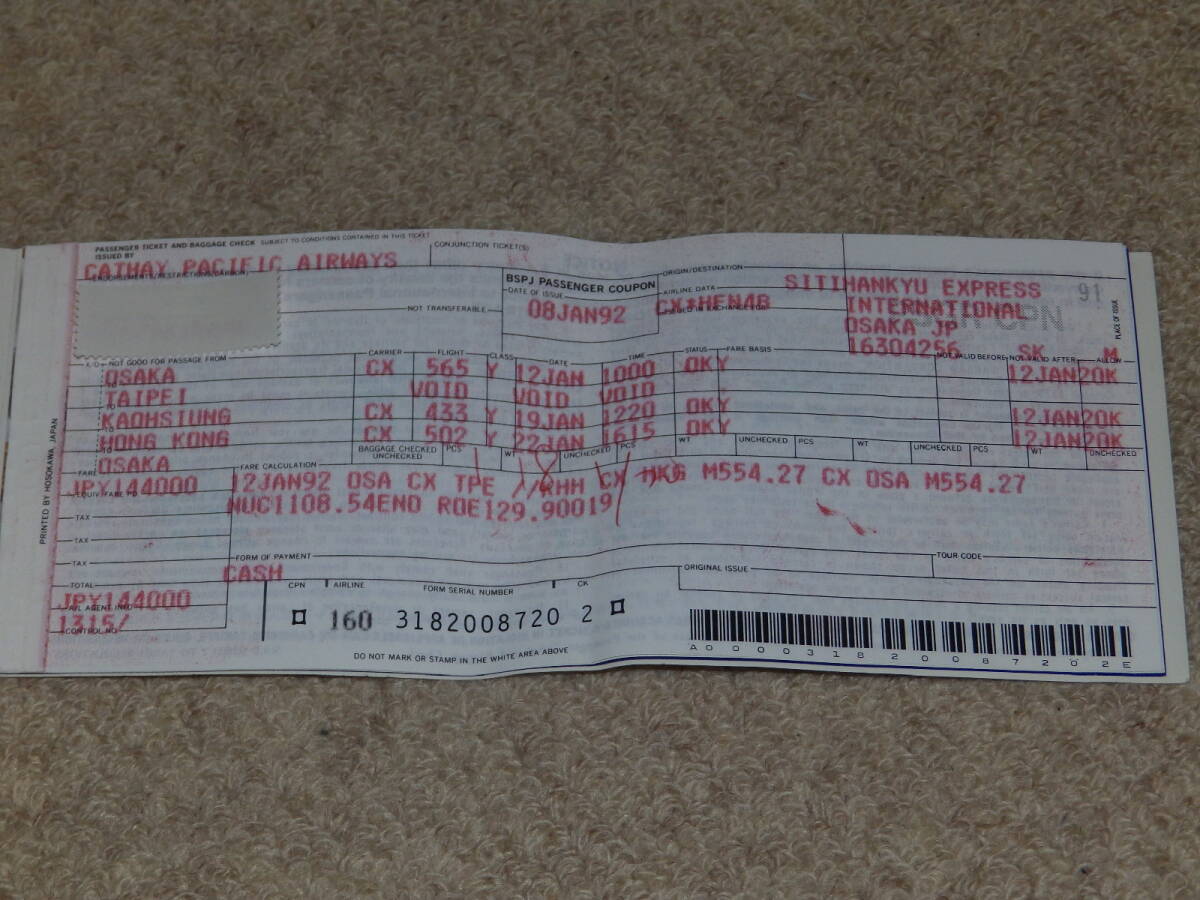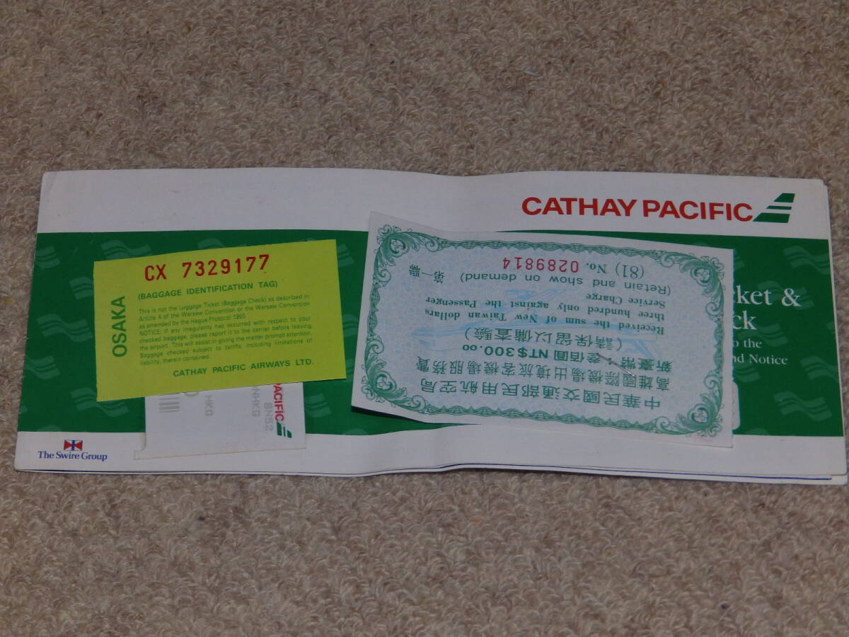 キャセイ航空 使用済航空券チケット 伊丹→台北、高雄→香港→伊丹 1992年1月8日発行 手荷物タグ2枚、中華民国出国税タグ付き