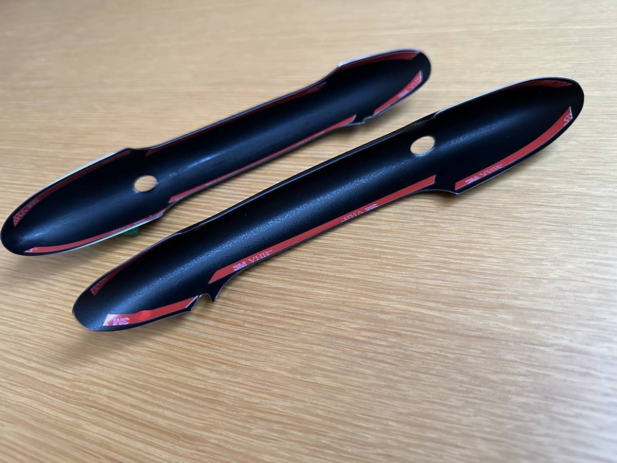 純正のクロームメッキのドアハンドルおよび給油キャップの上に、両面テープを使用して装着します。
