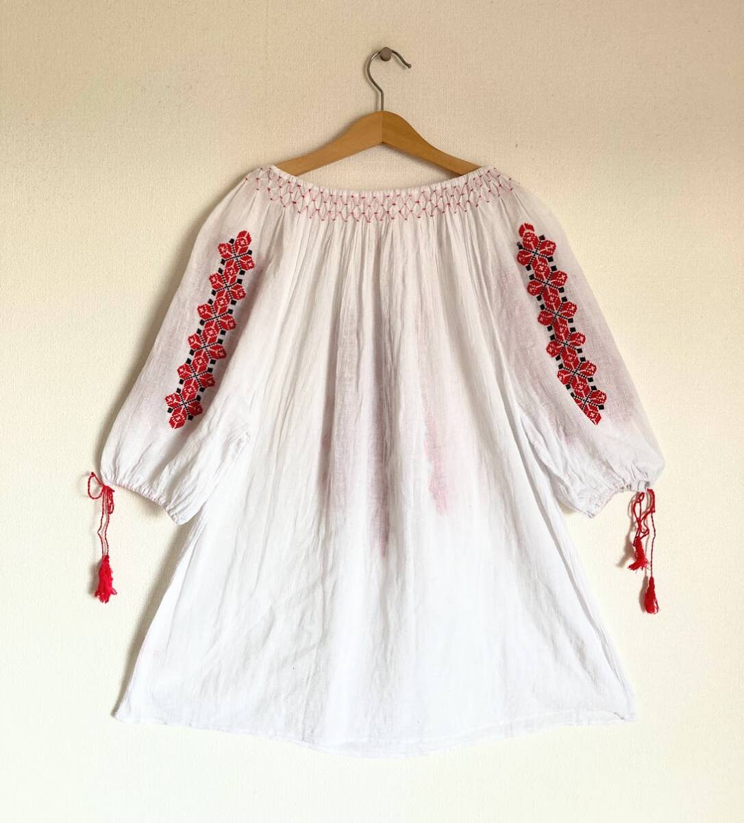 白地に赤糸の細かいクロスステッチが施されているルーマニアヴィンテージのプルオーバーブラウスです。