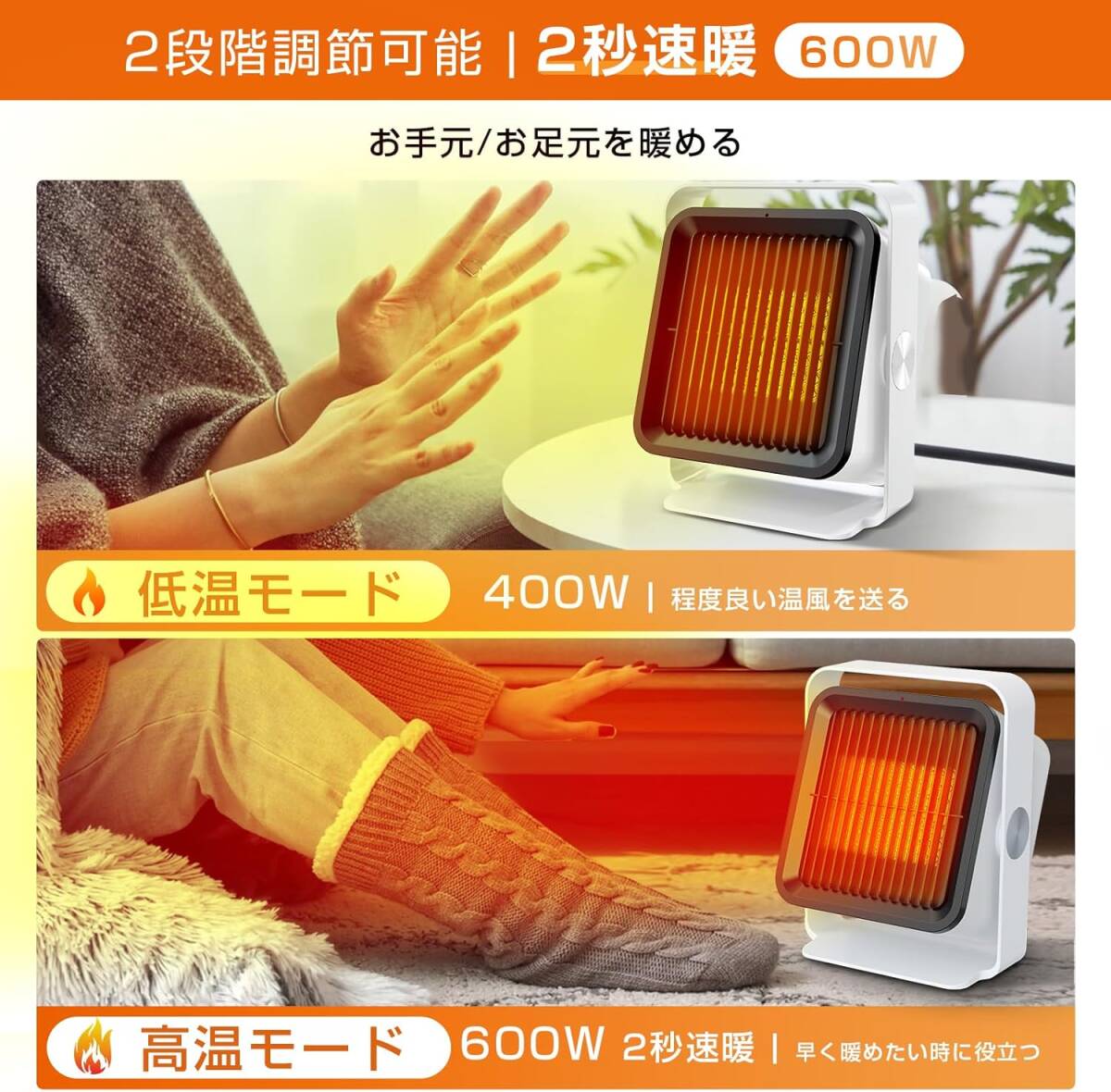 【2段階出力・2秒速暖】本セラミックファンヒーターは弱温風(400W)、強温風(600W)二つのモードが切り替え可能、温度や環境に応じた最適な暖房を提供します。強温風(600W)で約2秒速暖可能、早く暖めたい時に役立つ。